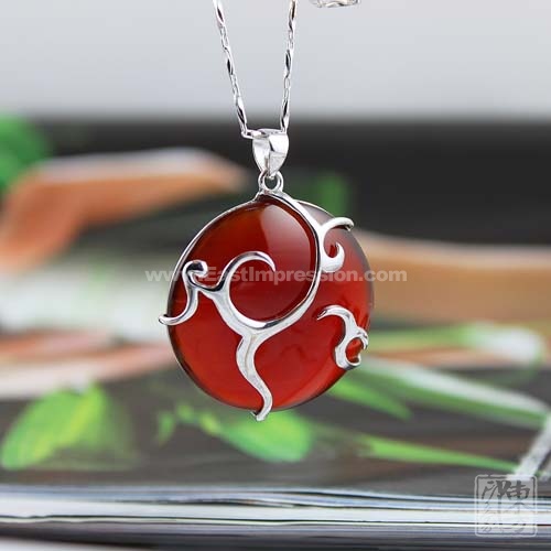 925纯银镀白金中国红玛瑙吊坠-有凤来仪