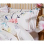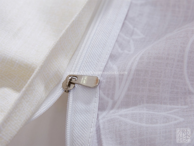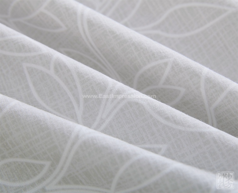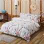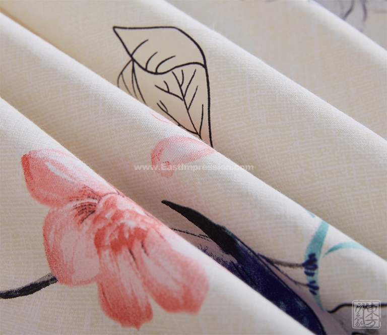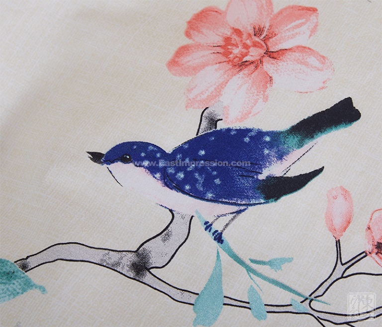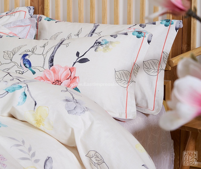 该套床品AB面设计,正面以柔和的米黄为主色调,背面以浅浅的灰色为主色调。整体构图疏朗,折枝花鸟图有序呈现。以线描的方式展现遒劲的枝干和叶脉,以浓墨重彩展现饱满艳丽的花朵和枝头驻足的禽鸟,犹如一幅花鸟小品,给人以清逸闲适的视觉享受。