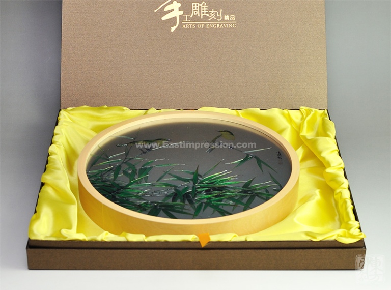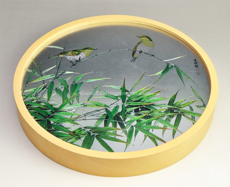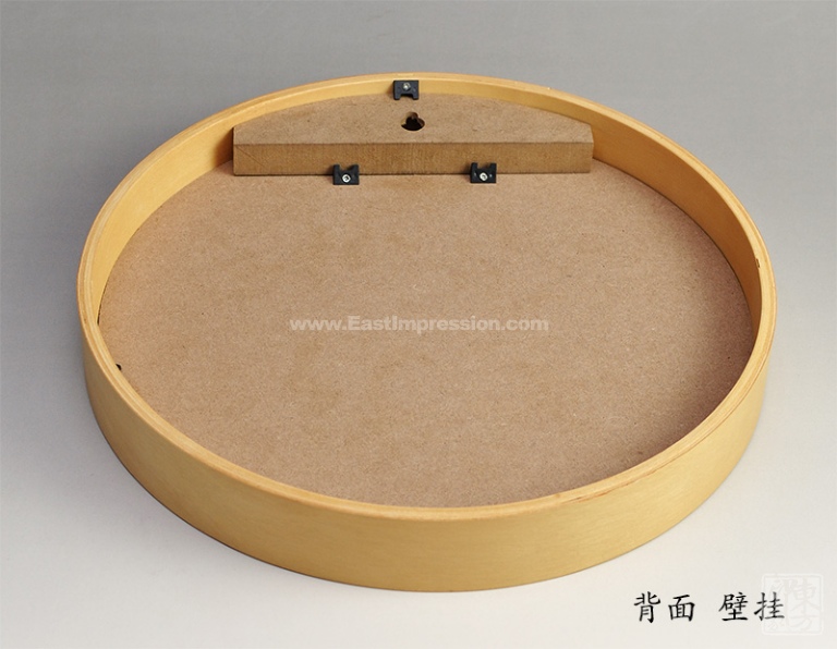 圆框采用桦木制成,其力学强度很大,而且富有弹性,表面机理光滑平整、花纹细腻明晰,清新自然的质感与铝板彩雕画的风格非常契合。画框背面设有挂孔,可直接挂在墙壁的钉子或挂钩上。