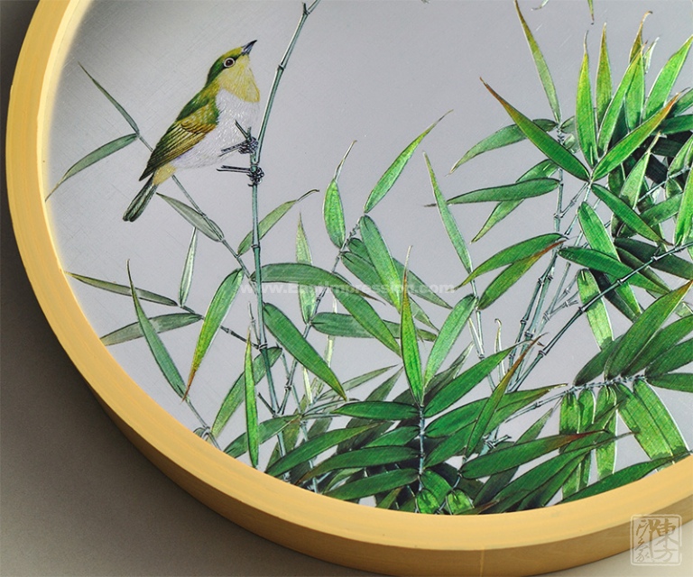 纯手工铝板彩雕工艺画的艺术手法独特,拉丝铝板的背景纹理与画面纹理在强光下清晰可见。画面构图疏密得当,纯手工雕刻工艺将竹枝、竹叶的轮廓勾勒得错落有致,竹叶上的纹理经“打沙”工艺处理得十分逼真,青翠欲滴犹如刚经过春雨的润泽。两只翠鸟相向而立,自然生动,翠鸟的羽毛如发丝般精细入微,其神态栩栩如生,好似工笔画的精密不苟、刻意求真。画中的每个局部细节都经过成千上万次的“千刀万刮”,配色清新明快,是一幅春意盎然,充满野趣的小品画。