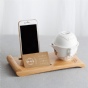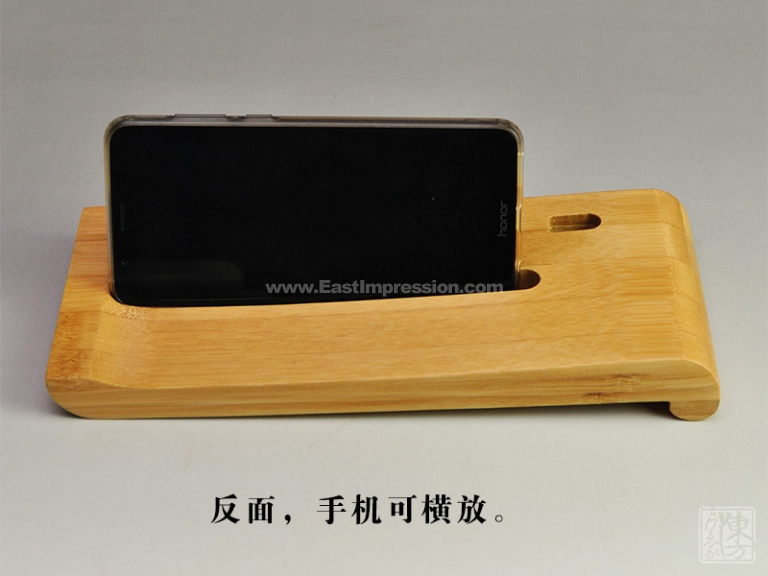 老孟宗竹制成的底座设计颇具巧思,集手机座、名片座、快客杯底座于一体,手机座凹槽两侧穿孔设计,很大程度上提升了手机音乐播放的音质。底座背面的长凹槽可横向固定手机,闲暇之余可观看手机节目。