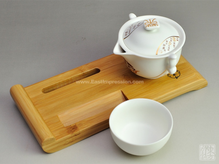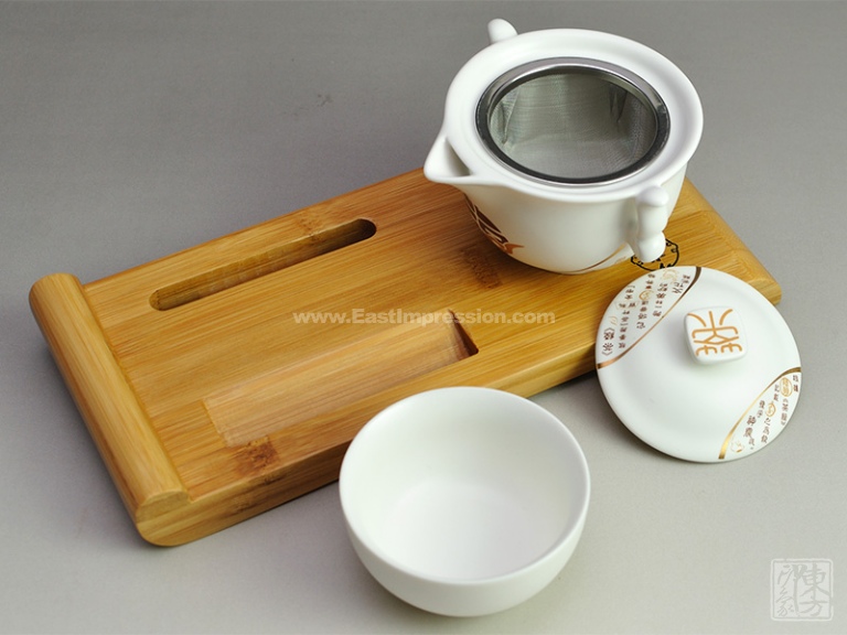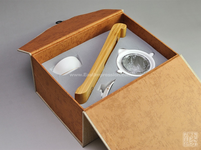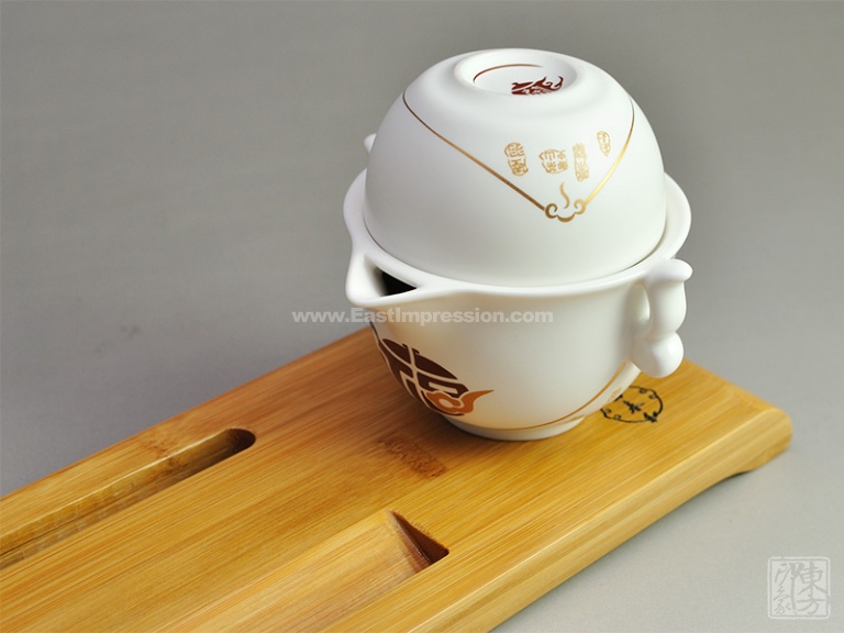 快客杯的胎釉为大名鼎鼎的定窑白,其胎质坚硬细腻,施釉极薄,釉面莹润如玉,釉色白中微闪黄,被形容为象牙白。壶杯以釉上彩的工艺装饰与“茶圣”陆羽、《茶经》相关的图文。壶身两侧防烫手的如意手柄及内置过滤网的设计均实用贴心。