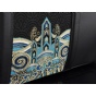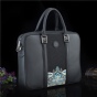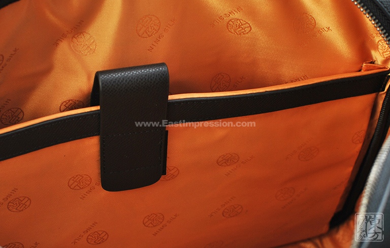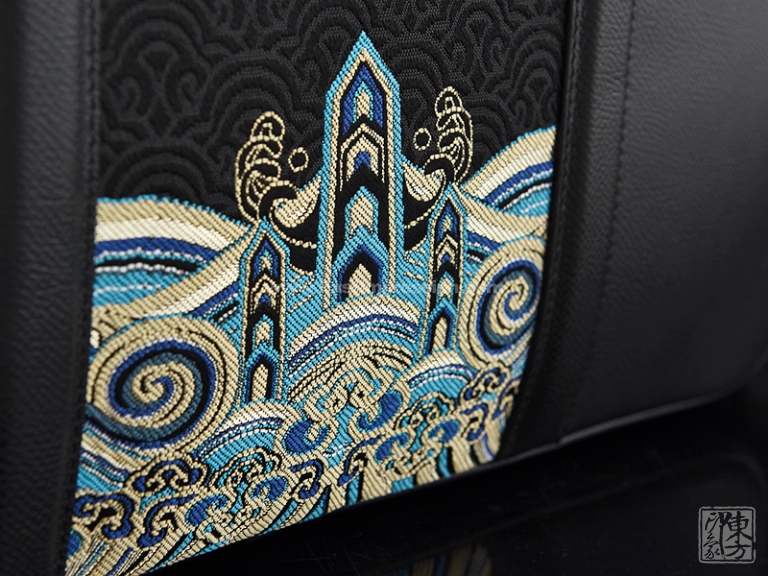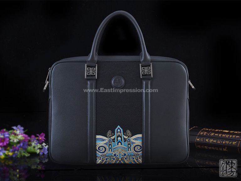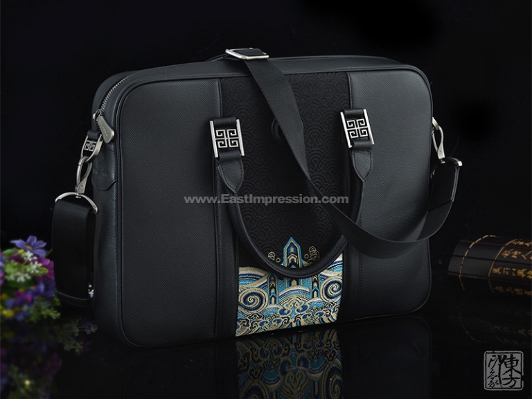 该款男士包将头层牛皮的考究耐磨与真丝云锦的细腻精致巧妙地结合在一起,三分比例设计对称稳重。“江崖海水纹”以不同明度的蓝(宝蓝、湖蓝)、不同明度的金(香槟金、暗金)、银白、墨绿等丝线精工织就,对称性的纹样充满繁复的韵律之美,体现了云锦喜用金的显著特色。它与黑底云锦海波纹、黑色牛皮的简约干净形成强烈反差,整体风格硬朗庄重又不失华贵大气之美。
