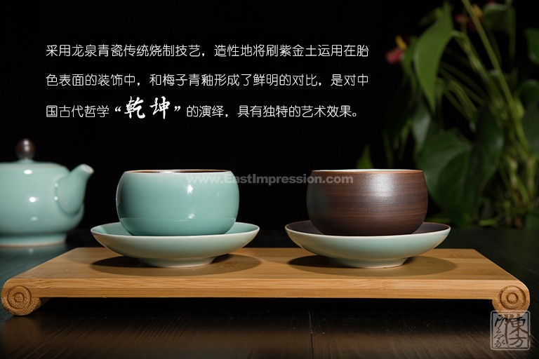 “乾坤”茶具一壶两杯,紫金土的装饰工艺被主要应用于茶杯的内外壁,茶碟的中心与外沿,质朴天然的赭褐色紫金土与光洁莹润的梅子青釉在色泽和触感上形成明显反差,是对中国古代哲学“乾坤”的演绎,令人自然联想到天地、阴阳、日月、男女、夫妇、刚柔……茶具是品茶悟道的载体,好的茶具不仅能提升茶味,亦能在品茗之中感悟天地人生。