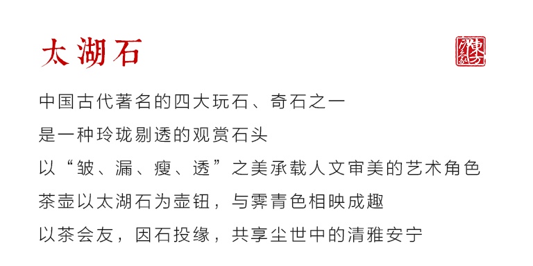 “太湖石”中国古代著名的四大玩石、奇石之一(英石、太湖石、灵璧石、黄蜡石),因盛产出于太湖地区而古今闻名,是一种玲珑剔透的观赏石头。“太湖石”又名窟窿石、假山石,是由石灰岩遭到长时间侵蚀后慢慢形成的,分有水石和干石两种。水石是在河湖中经水波荡涤,历久侵蚀而缓慢形成的。干石则是地质时期的石灰石在酸性红壤的历久侵蚀下而形成。形状各异,姿态万千,通灵剔透的太湖石,最能体现“皱、漏、瘦、透”之美。