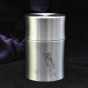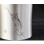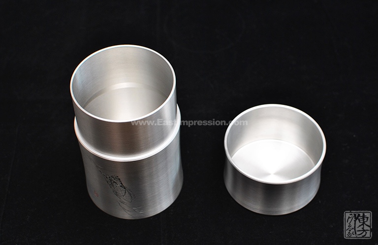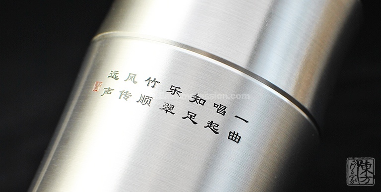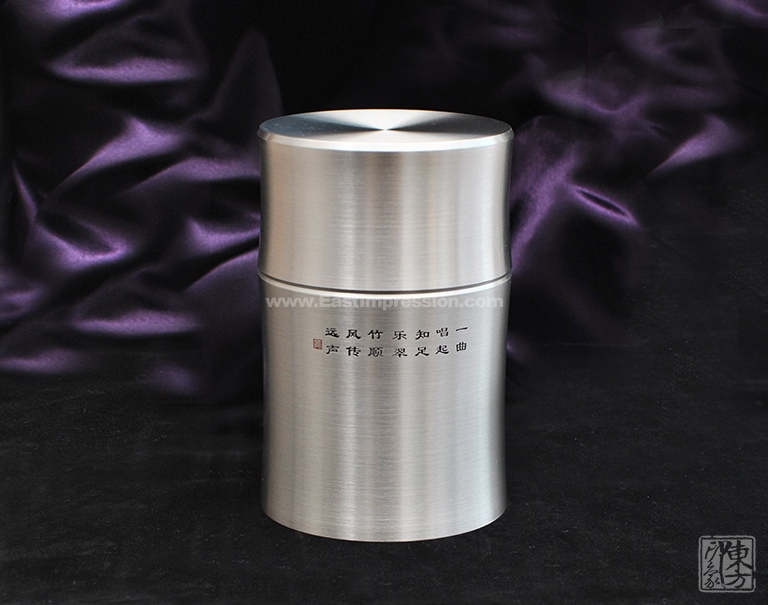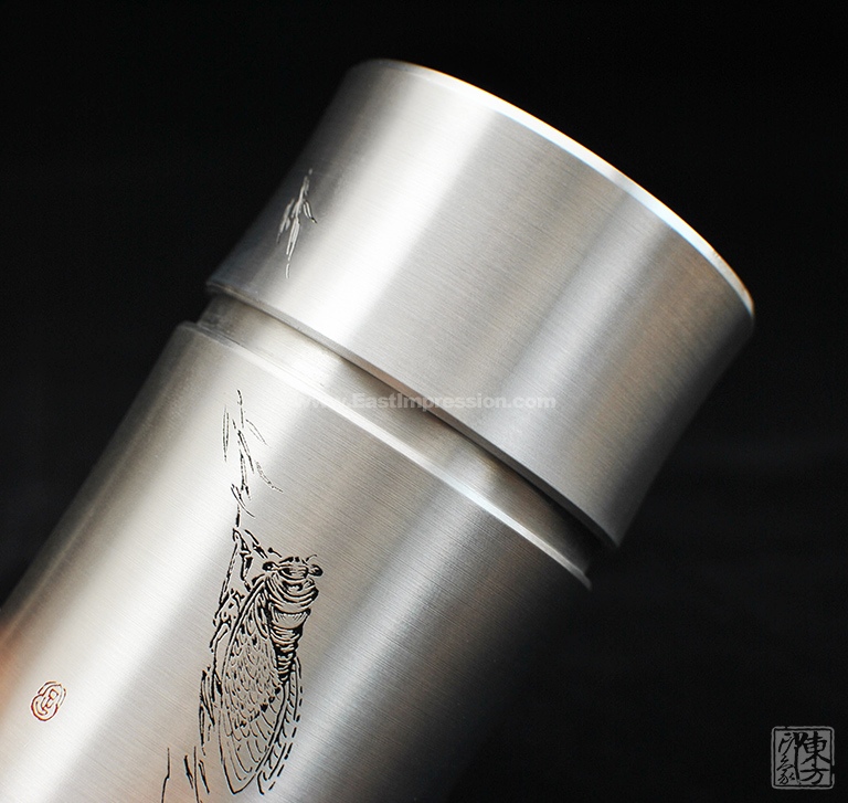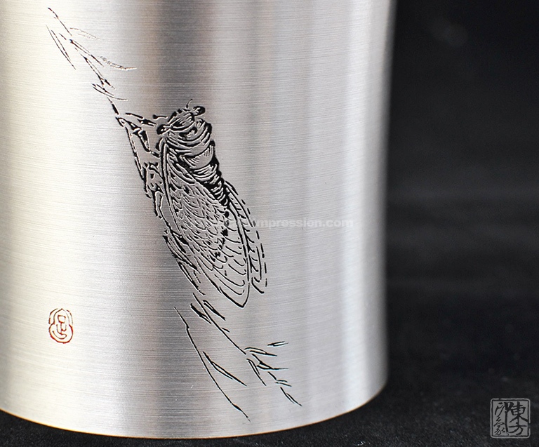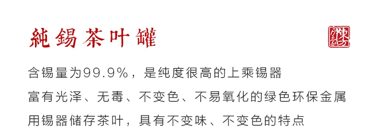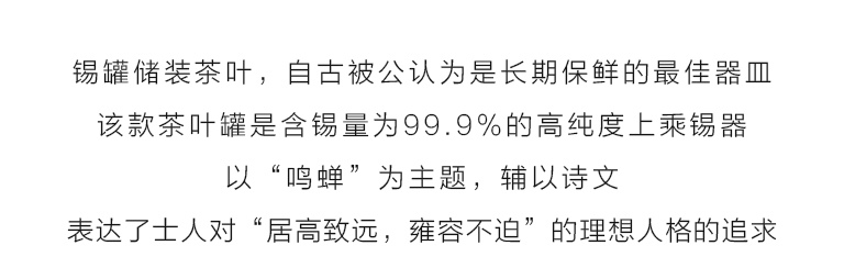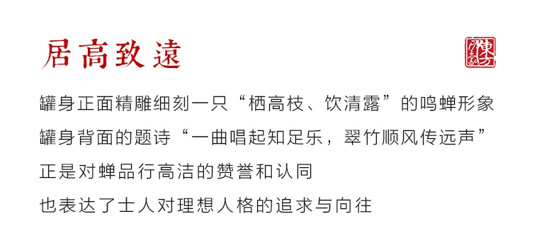 含锡量为99.9%的纯锡茶叶罐,属上乘锡器,色如银,亮如镜,抚之平和柔滑,银亮高贵的光泽历久常新。器型简约大气,罐身正面精雕细刻一只“栖高枝、饮清露”的鸣蝉形象,罐身背面的题诗“一曲唱起知足乐,翠竹顺风传远声”,正是对蝉品行高洁的赞誉和认同,也表达了士人对理想人格的追求与向往。