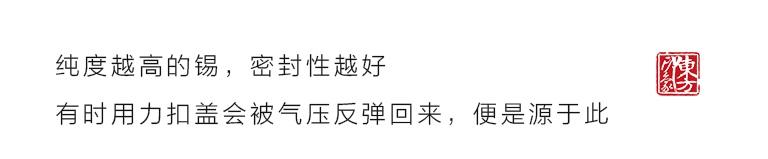 是纯锡的 由于密封性特别好 盖子一下盖不到底的 气压所致 整体造型也很漂亮 简洁清雅