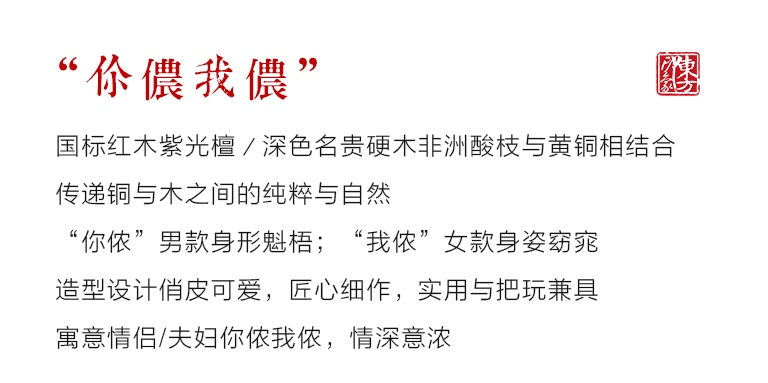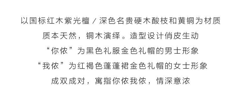 铜木传奇钥匙扣将国标红木紫光檀/深色名贵硬木非洲酸枝与黄铜相结合,传递铜与木之间的纯粹与自然。造型设计俏皮可爱,“你侬”男款黑色礼服金色礼帽,身形魁梧;“我侬”女款红褐色蓬蓬裙金色礼帽,身姿窈窕。匠心细作,实用与把玩兼具,寓意情侣/夫妇你侬我侬,情深意浓。