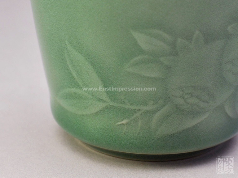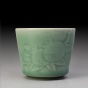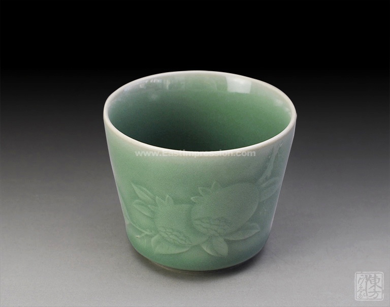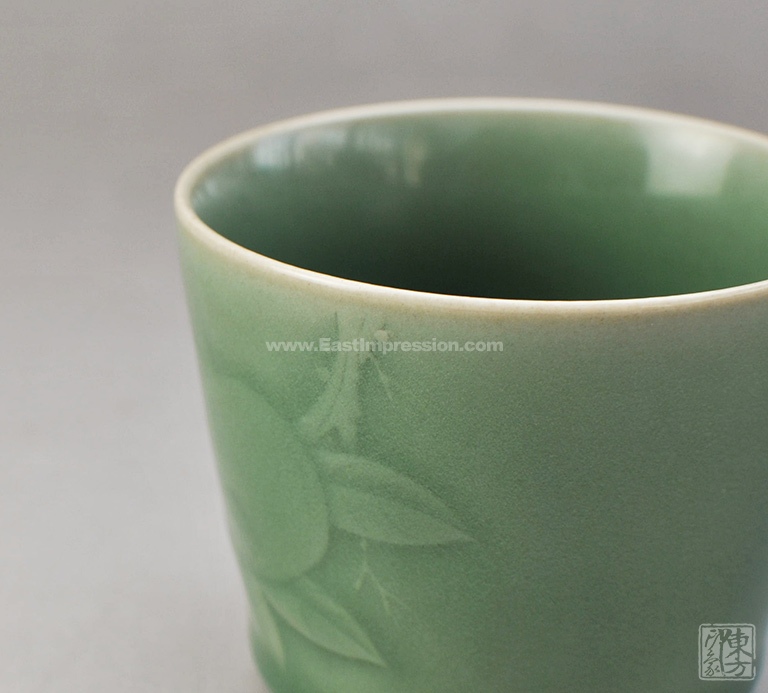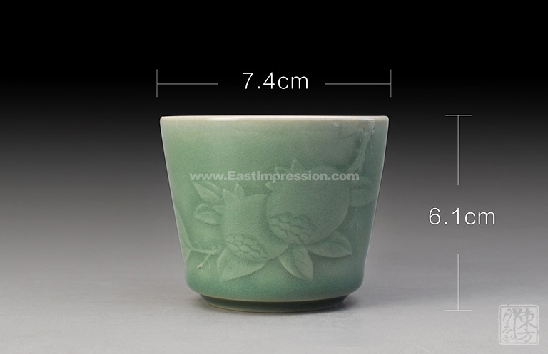 青瓷艺人向来追求“釉色如玉”,弟窑产品可谓达到了这样的艺术境界。老梅子青釉面莹润,犹如翡翠色泽,给人以沉静美好的视觉享受。桶型杯,从下至上微微外撇,圆融中亦见线条之爽利。自杯沿处探出一簇石榴枝叶,主枝干粗壮分叉出细条小枝,叶脉纹理清晰,两颗圆圆的大石榴缀在枝头,侧面露出粒粒饱满的籽,蕴涵榴开百子、笑口常开、丰收繁荣的吉祥寓意。