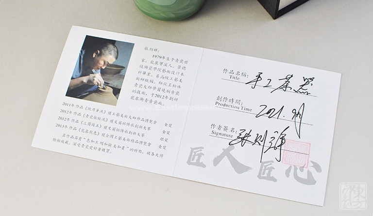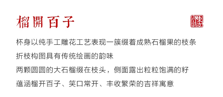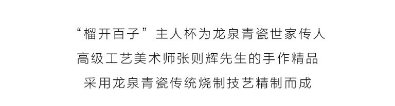 “榴开百子”主人杯由青瓷世家传人、高级工艺美术师张则辉先生创意设计,采用龙泉青瓷传统烧制技艺精制而成。其制作过程中的关键环节如拉坯、修坯、雕花、施釉均由张则辉先生纯手工完成,施老梅子青釉后的烧成温度在1320度左右。