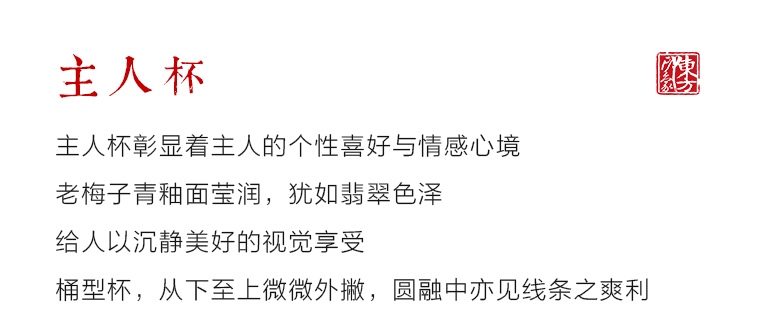 主人杯就是自己的品茗杯,比起套组更有自我的个性。持有者通过杯子表达心境,它能体现茶道爱好者的个人情感。泡茶中有独一无二的杯子,间接也显示了主人的身份。从杯子绘画的图案、颜色、器形等均可以展示主人的个性修养。一件日常物品如果充满爱意地使用,就会被赋予灵魂,成为生命无可替代的一部分,主人杯即是如此。