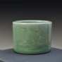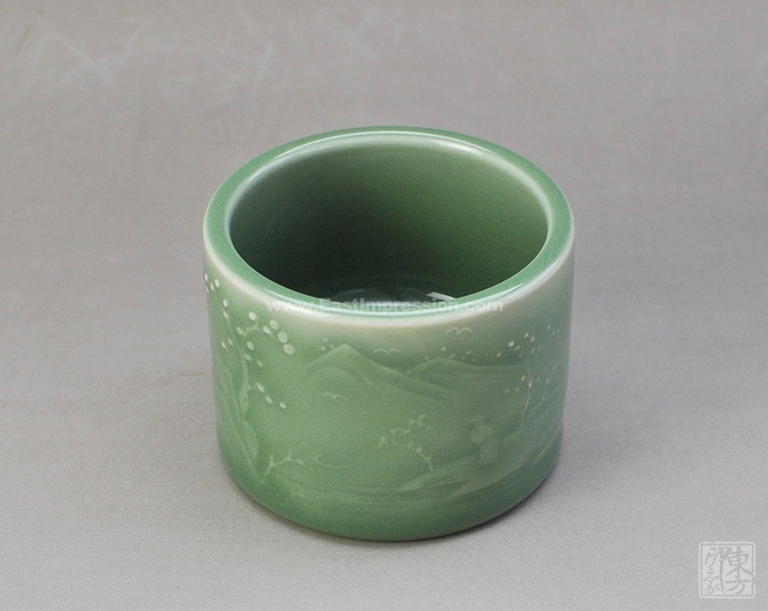 青瓷艺人向来追求“釉色如玉”,弟窑产品可谓达到了这样的艺术境界。老梅子青釉面莹润,犹如翡翠色泽,给人以沉静美好的视觉享受。直桶杯型,线条干净利落。杯壁刻画了一幅宁静致远的秋山水景致,秋山含水有清辉,秋叶落尽果满枝。一头戴斗笠之人,身形前倾,似在观游鱼,似在赏秋色,这份秋日寂寥里的悠然自得,正是小隐隐陵薮的写照。