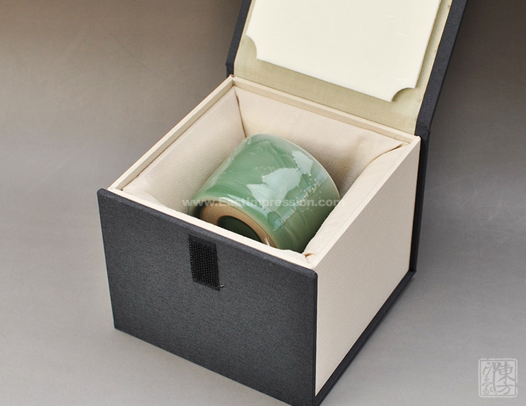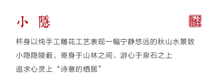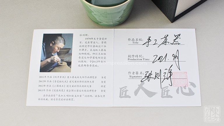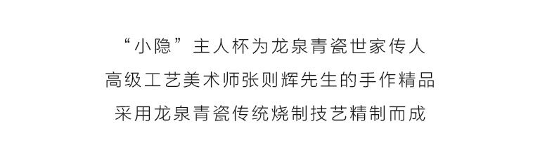 “小隐”主人杯由青瓷世家传人、高级工艺美术师张则辉先生创意设计,采用龙泉青瓷传统烧制技艺精制而成。其制作过程中的关键环节如拉坯、修坯、雕花、施釉均由张则辉先生纯手工完成,施老梅子青釉后的烧成温度在1320度左右。