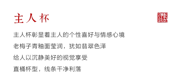 主人杯就是自己的品茗杯,比起套组更有自我的个性。持有者通过杯子表达心境,它能体现茶道爱好者的个人情感。泡茶中有独一无二的杯子,间接也显示了主人的身份。从杯子绘画的图案、颜色、器形等均可以展示主人的个性修养。一件日常物品如果充满爱意地使用,就会被赋予灵魂,成为生命无可替代的一部分,主人杯即是如此。