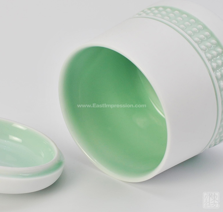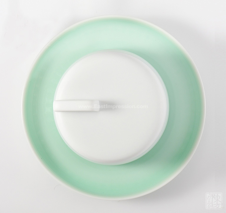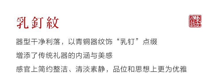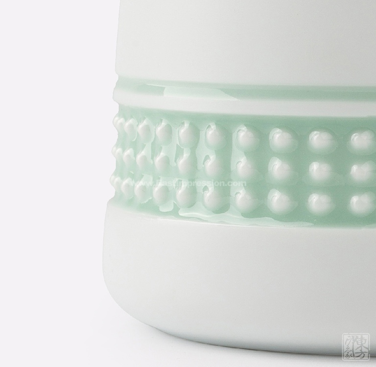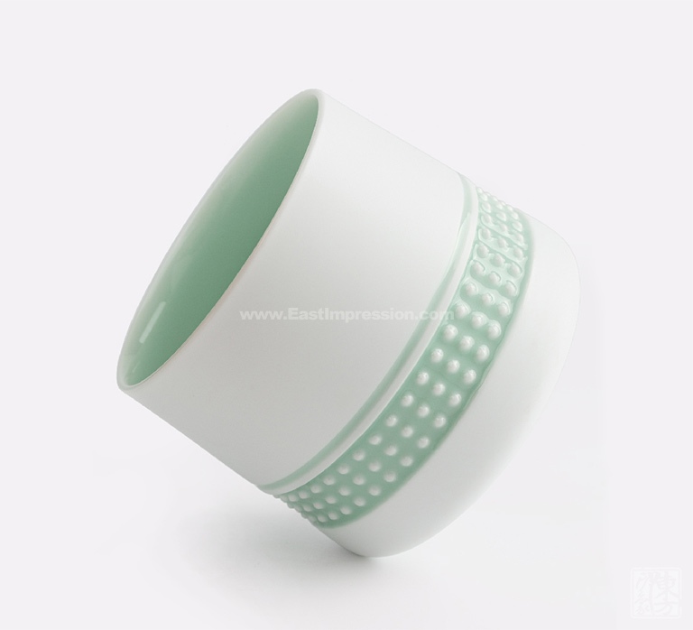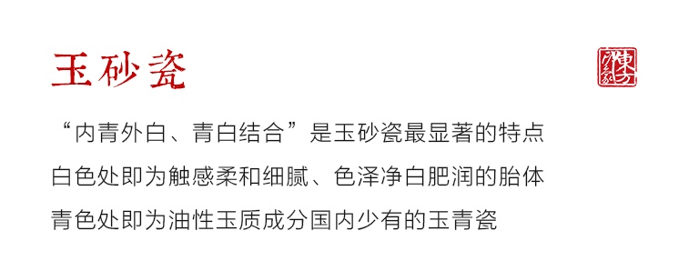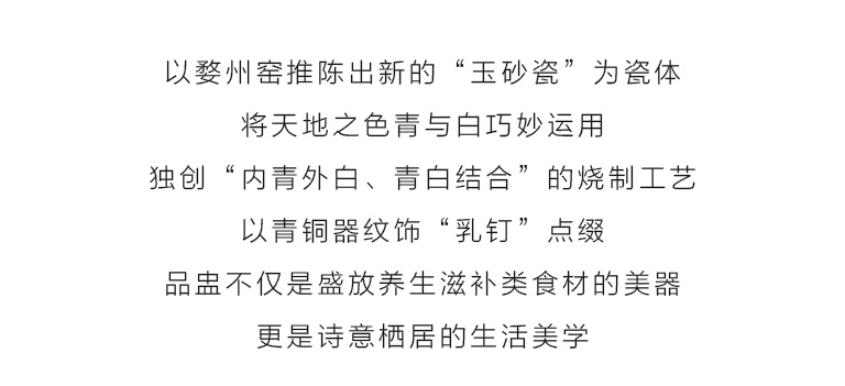 “内青外白、青白结合”是玉砂瓷最显著的特点。白色处即为触感柔和细腻、色泽净白肥润的胎体(不上釉),青色处即为油性玉质成分国内少有的玉青瓷。青白原为天地之色,器型干净利落,青铜器纹饰乳钉的设计增添了传统礼器的内涵与美感,其营造的清心之境与美食美器一起养颜又养心。