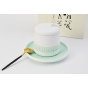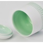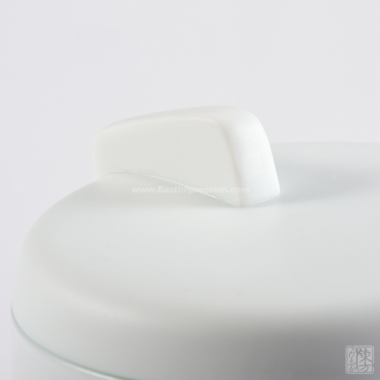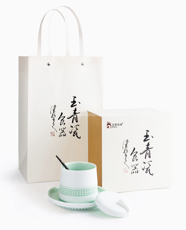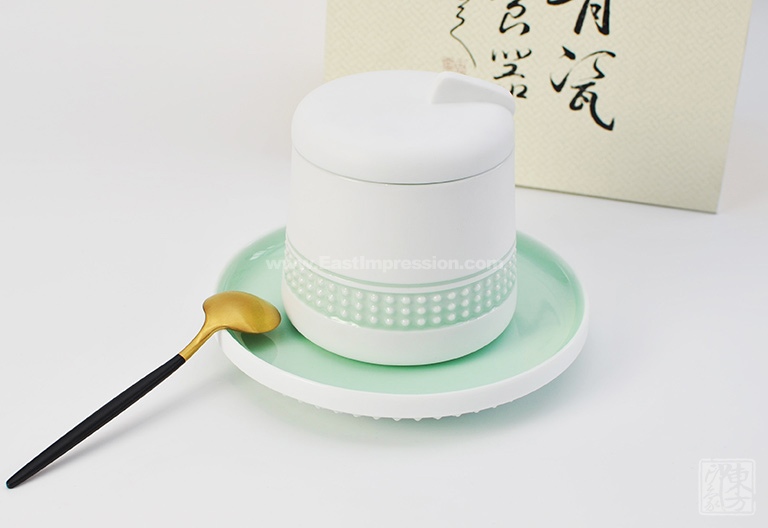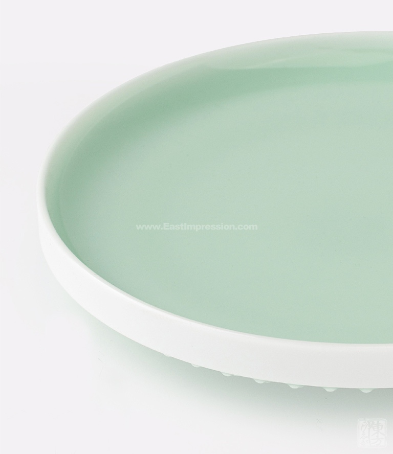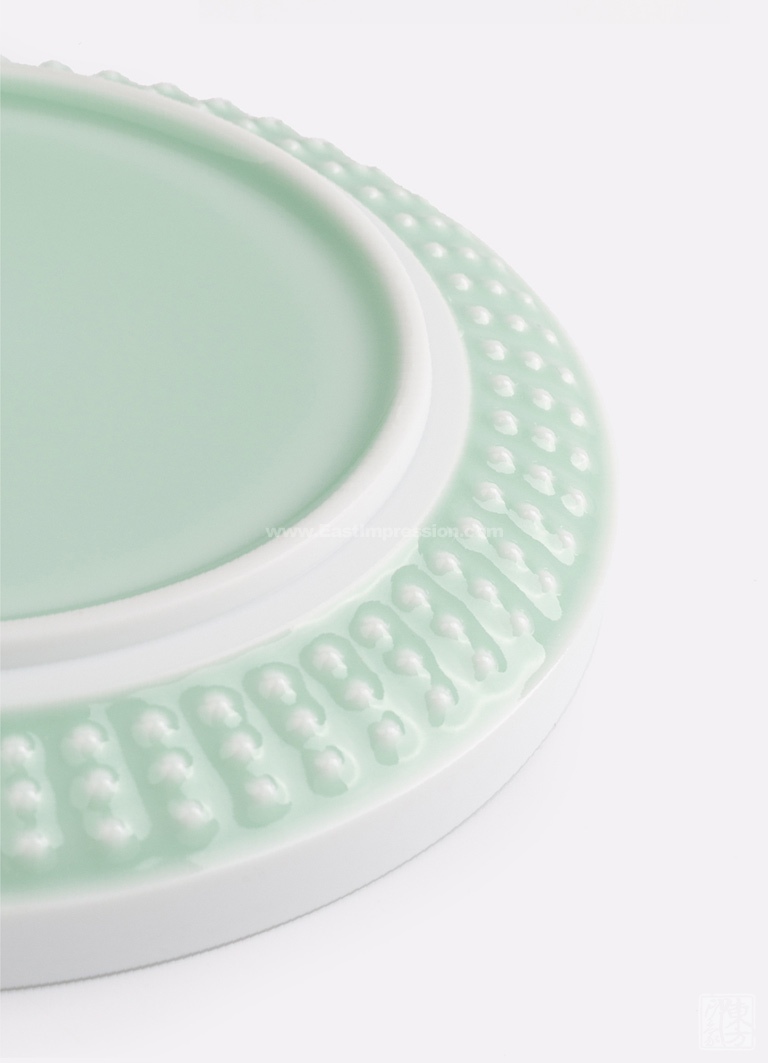 “内青外白、青白结合”是玉砂瓷最显著的特点。白色处即为触感柔和细腻、色泽净白肥润的胎体(不上釉),青色处即为油性玉质成分国内少有的玉青瓷。青白原为天地之色,器型干净利落,青铜器纹饰乳钉的设计增添了传统礼器的内涵与美感,其营造的清心之境与美食美器一起养颜又养心。