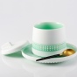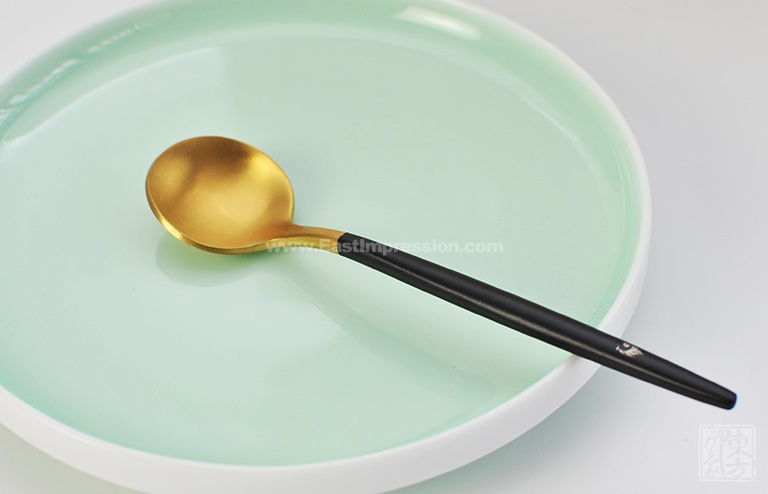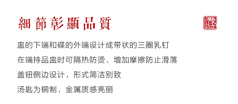盅的下端和碟的外端设计成带状的三圈乳钉,在端持品盅时可隔热防烫、增加摩擦防止滑落。盖钮侧边设计,形式简洁别致。汤匙为铜制,金属质感亮丽。