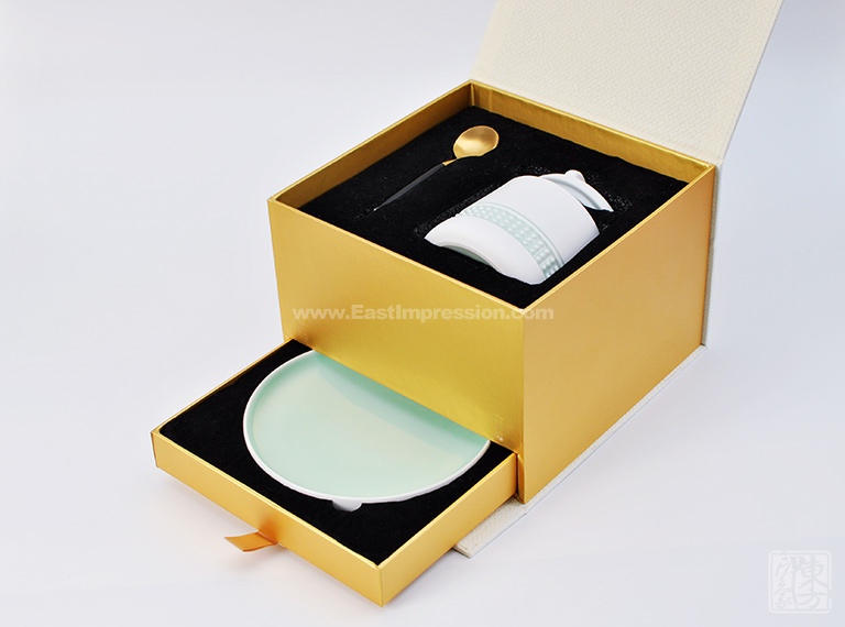 婺州窑,位于今浙江金华地区,是我国青瓷的著名产地之一。该套品盅精选优质甲等高岭土和高纯度石英,以金华特有的黄蜡石入釉,将婺州窑传统烧制技艺(为浙江省非物质文化遗产生产性保护基地)发扬光大、推陈出新,辅之以“正负压交叉柔性还原”的现代技术,独创“内青外白、青白结合”的玉砂瓷。