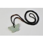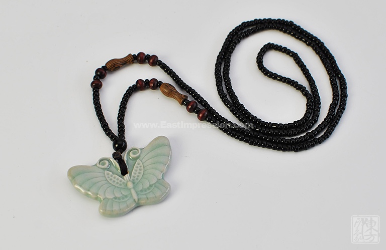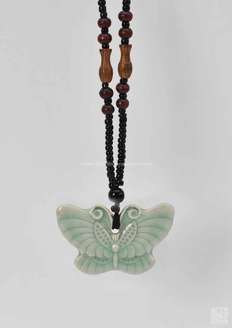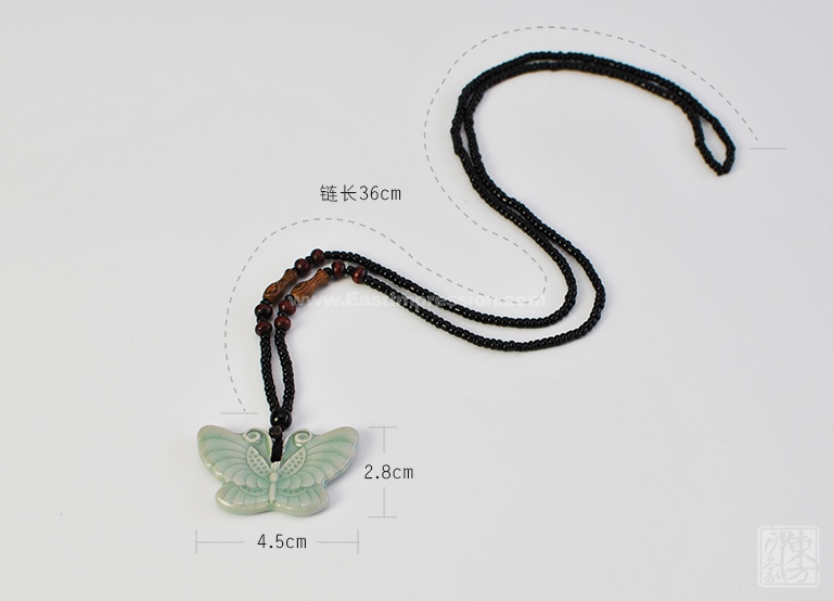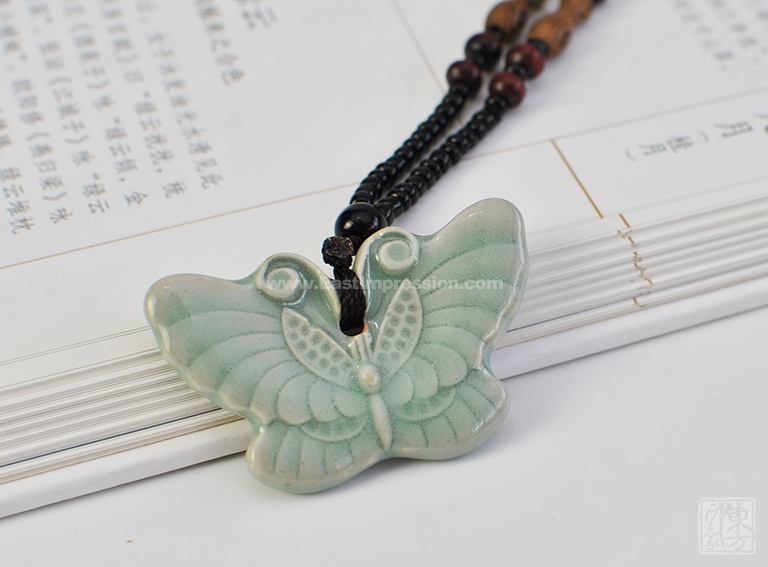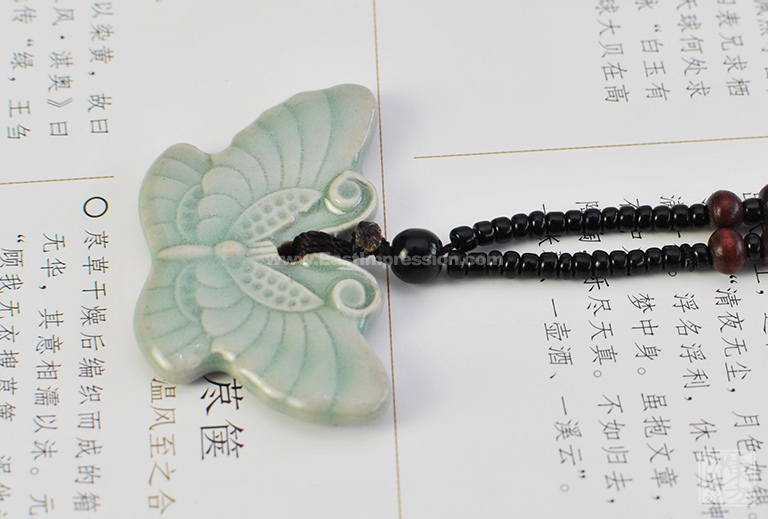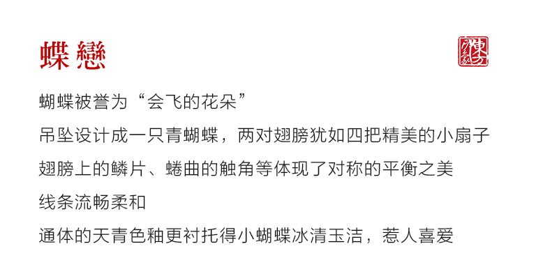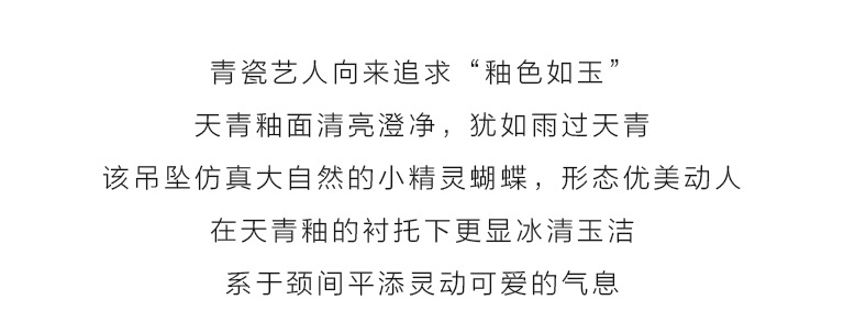 蝴蝶被誉为“会飞的花朵”。该吊坠设计成一只美丽的青蝴蝶,前后两对翅膀犹如四把精美的小扇子。翅膀上的鳞片、蜷曲的触角等体现了对称的平衡之美,线条流畅柔和,通体的天青色釉更衬托得小蝴蝶冰清玉洁,惹人喜爱。