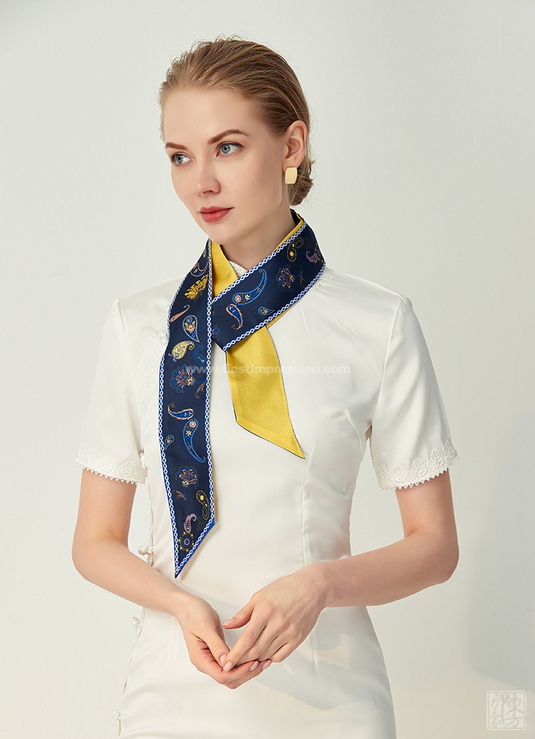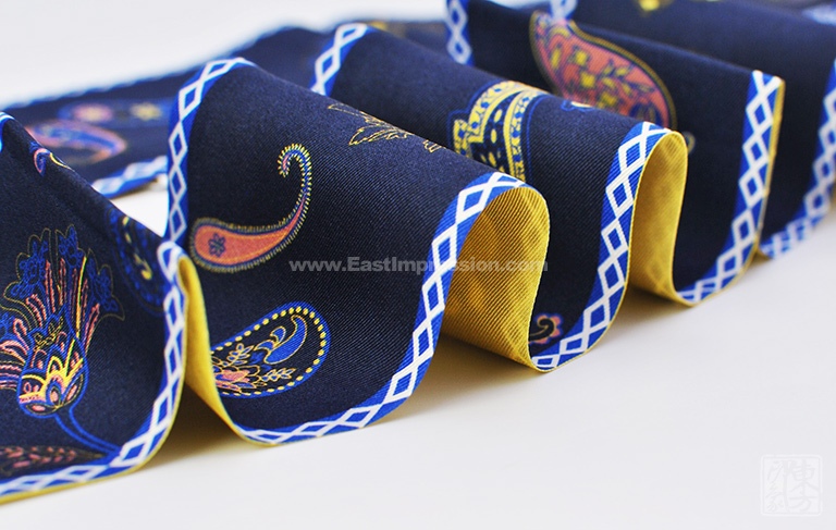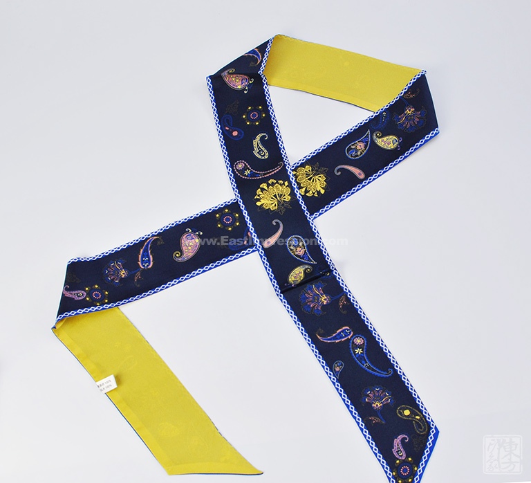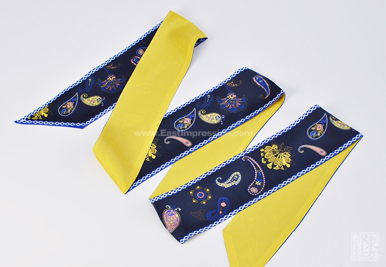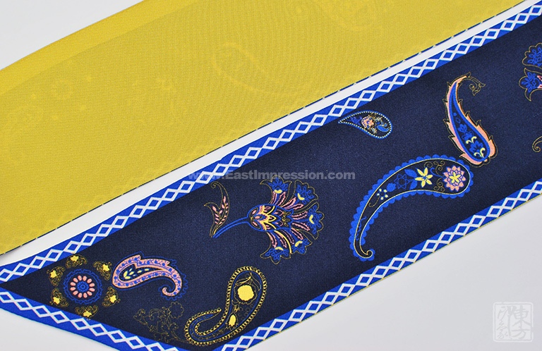 真丝斜纹绸散发出自然柔和的丝绸光泽。一面以明媚跃动的明黄为底色,仿佛金丝雀一样会腾空飞起;一面以深邃神秘的藏蓝为底色,佩斯利涡纹旋花纹如一个个迷离华丽的音符在跳动,独一无二的精细纹理和妖娆多姿的花饰,带我们走进迷幻优雅的佩斯利世界。
