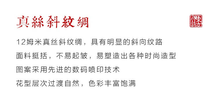 真丝面料是纯桑蚕白织丝织物,采用斜纹组织编制。根据织物平方米重量,分为薄型和中型。根据后加工不同分为染色、印花两种。它的质地柔软光滑,手感柔和、轻盈,花色丰富多彩,穿着凉爽舒适。主要用作夏令衬衫、睡衣、连衣裙面料及头巾等等。