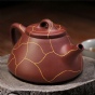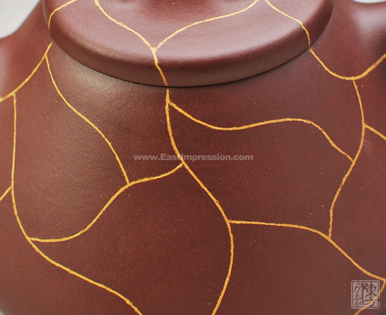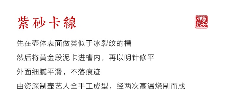 紫砂卡线:先在壶体表面做类似于冰裂纹的槽,然后将黄金段泥卡进槽内,再以明针修平,外面细腻平滑,不落痕迹。