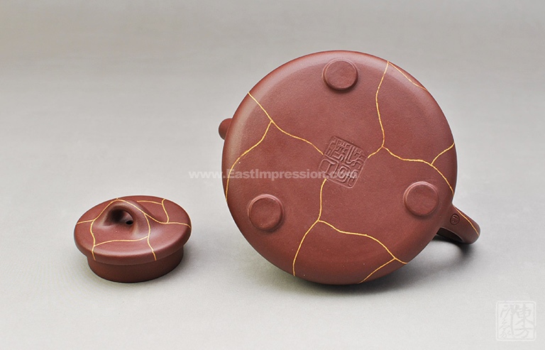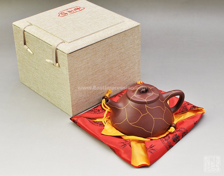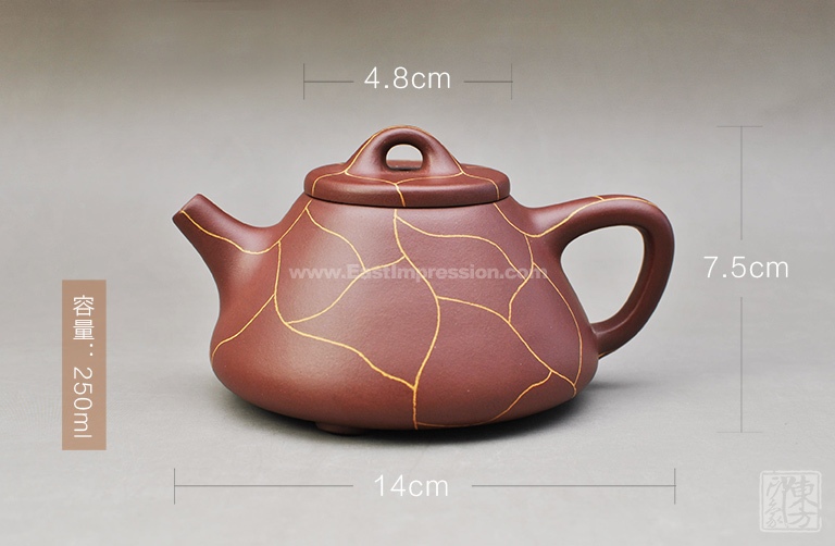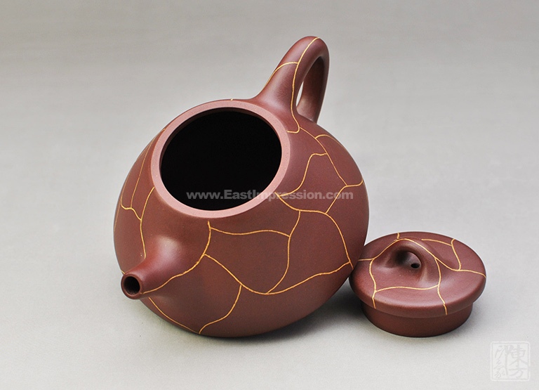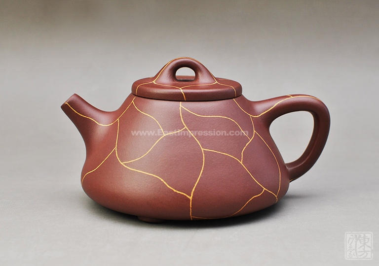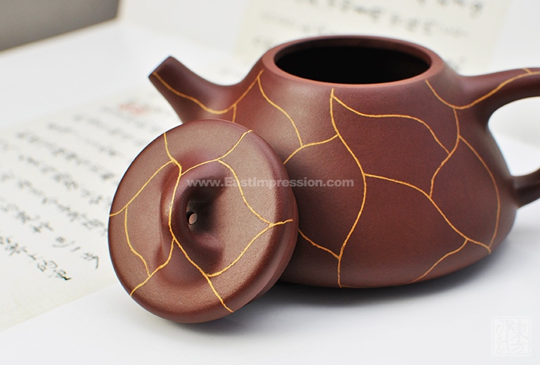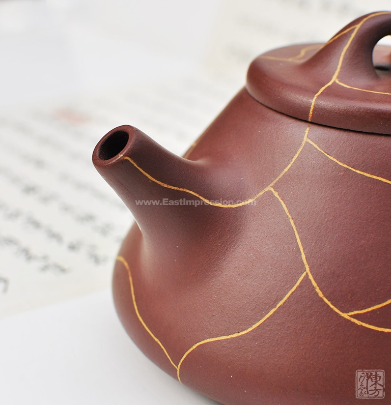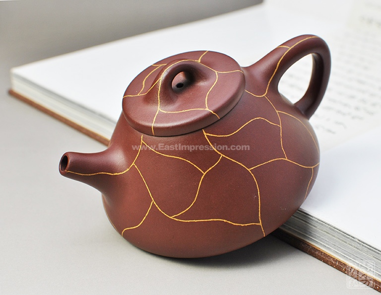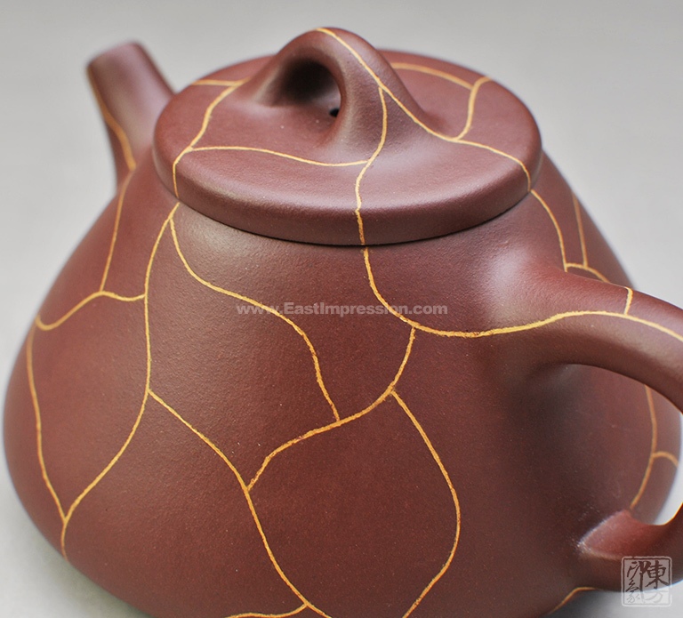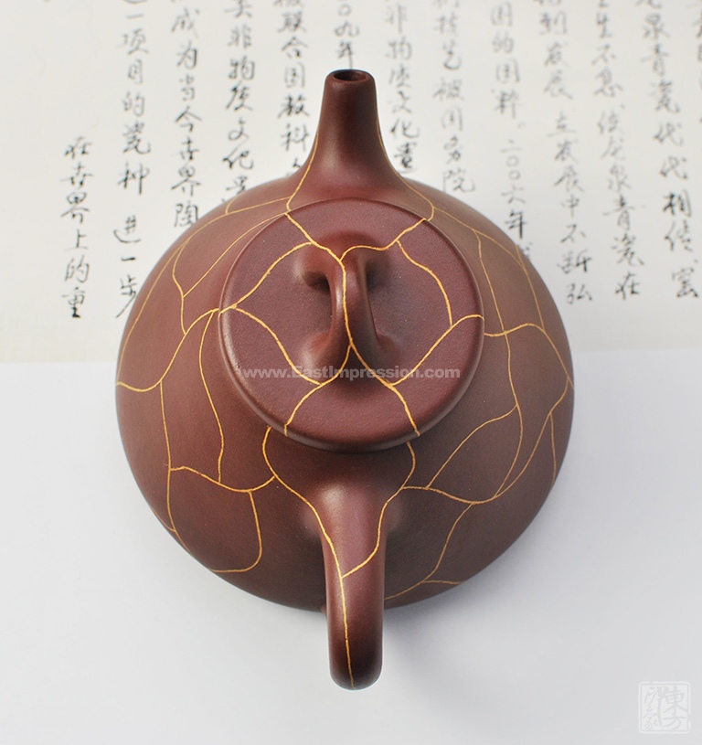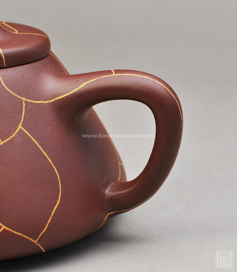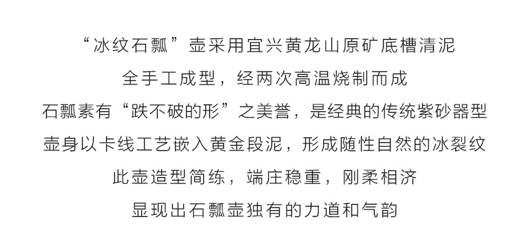 “冰纹石瓢”紫砂壶采用宜兴原矿底槽清泥,冰纹以卡线工艺嵌入黄金段泥,由资深制壶艺人全手工成型,经两次高温烧制而成。