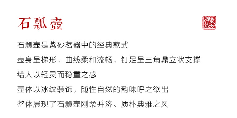 石瓢壶是紫砂茗器中的经典款式,壶身呈梯形,曲线柔和流畅,钉足呈三角鼎立状支撑,给人以轻灵而稳重之感。长直流嘴,倒三角把,亦曲亦直。无壶颈,平压盖,桥型钮,干净利索,比例和谐。壶体以冰纹装饰,随性自然的韵味呼之欲出,整体展现了石瓢壶刚柔并济、质朴典雅之风。
