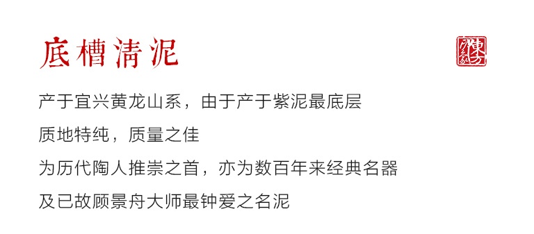 底槽清泥,产于宜兴黄龙山系,由于产于紫泥最底层,质地特纯,质量之佳,为历代陶人推崇之首,亦为数百年来经典名器,及已故顾景舟大师最钟爱之名泥。