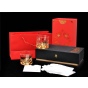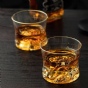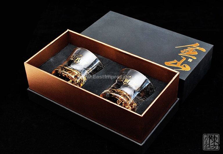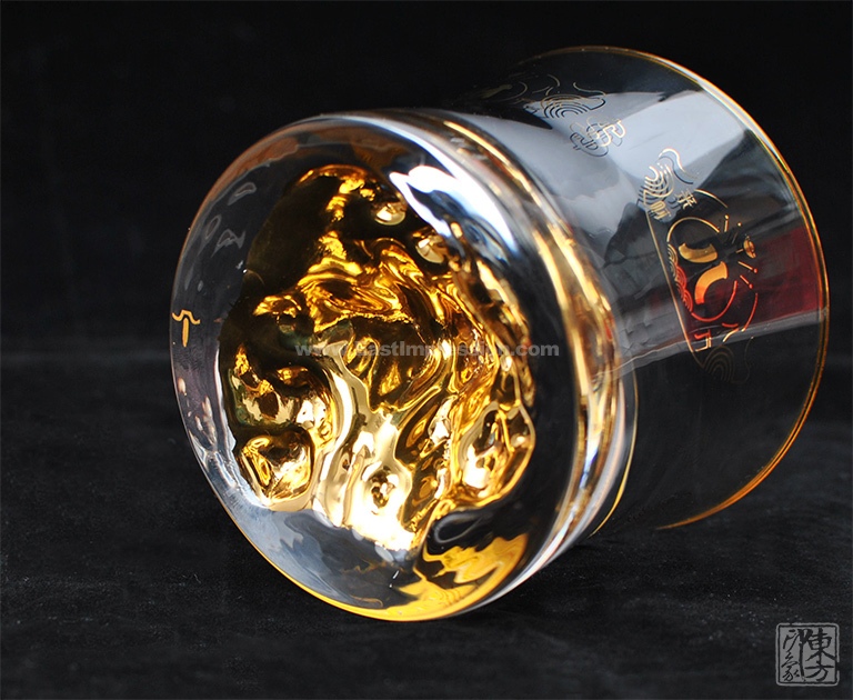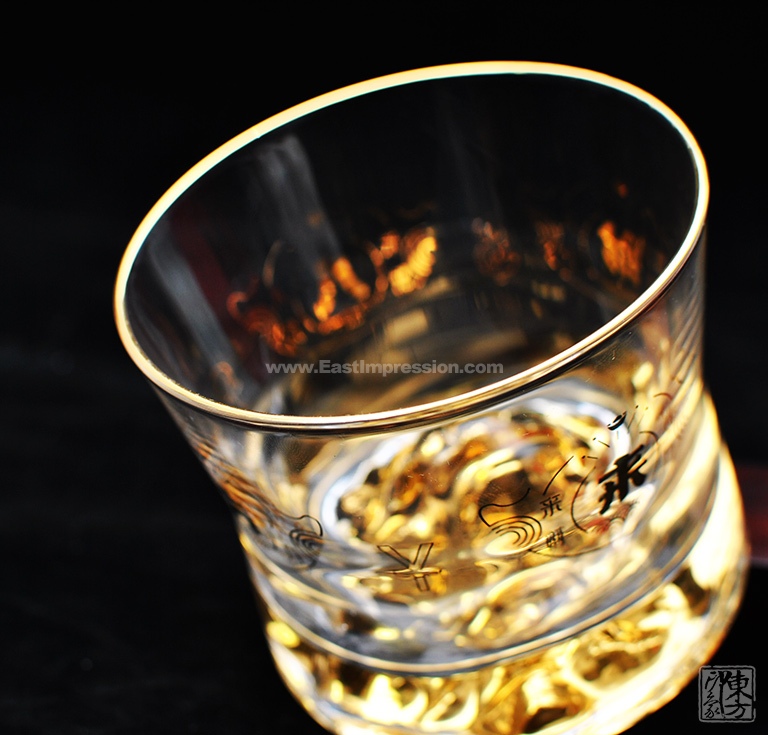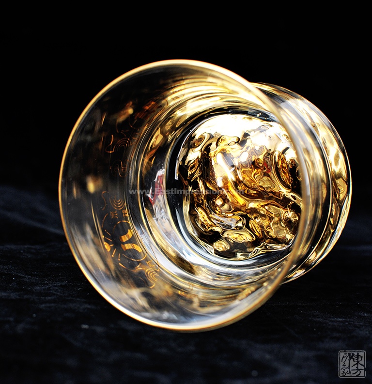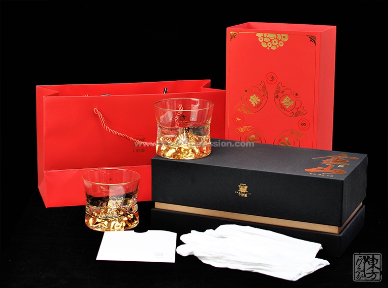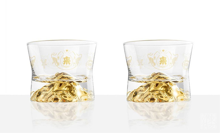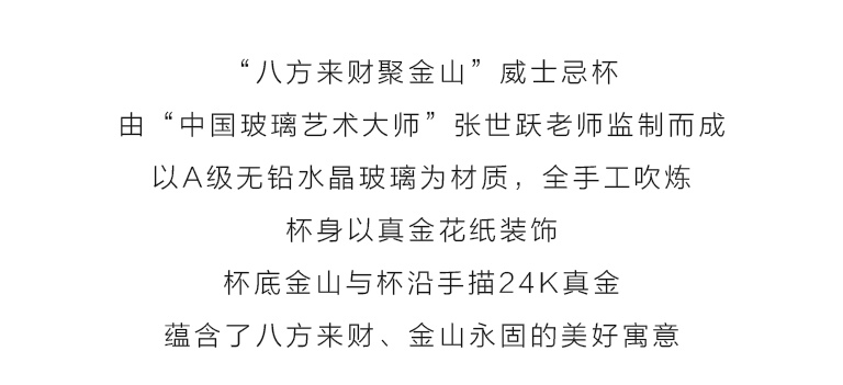 威士忌杯线条简洁,杯身微收握持舒适,通体清澈晶莹,底部金山立体生动,光泽璀璨。酒入杯中金山立体呈现,在一片金光晕染中熠熠生辉。杯身以“八方来财”花纸装饰,金元宝图案及钱币符号八方分布,将“八方来财、金山永固”的美好寓意淋漓尽显。