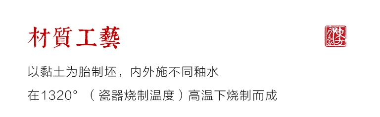 以黏土为胎制坯,内外施不同釉水,在1320°(瓷器烧制温度)高温下烧制而成。