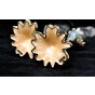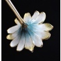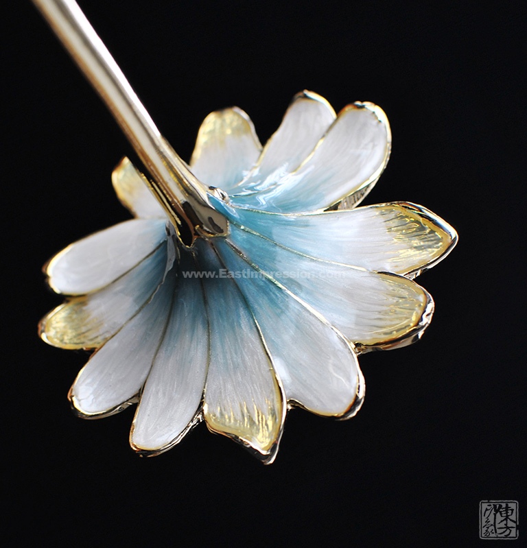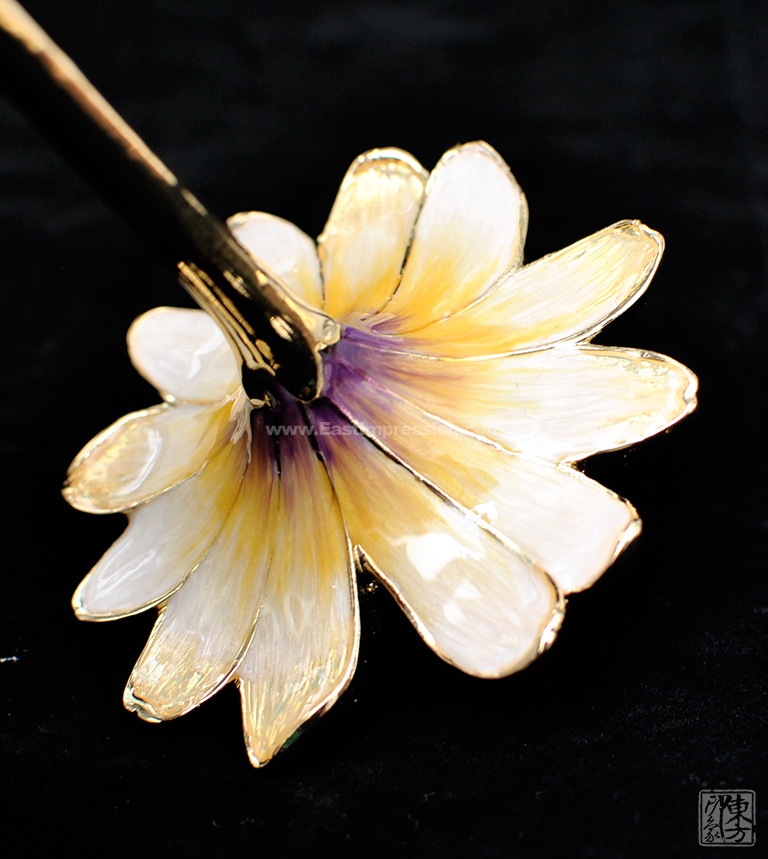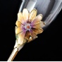 杯座以绽放的雏菊花瓣托起杯柄、杯身,上方又以大小两朵雏菊包覆于杯身,淡雅的花瓣以珐琅彩的匠心工艺层层着色,花瓣边缘镶起华贵的金边,花蕊则以璀璨的水钻镶嵌。
