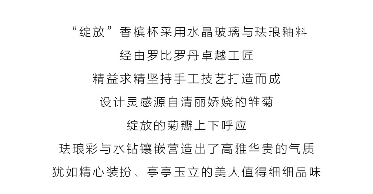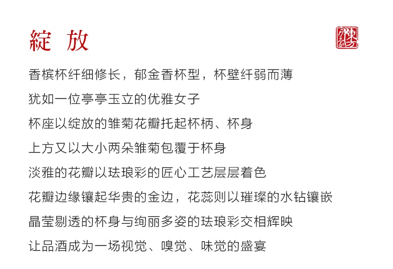 晶莹剔透的杯身与绚丽多姿的珐琅彩交相辉映,让品酒成为一场视觉、嗅觉、味觉的盛宴。