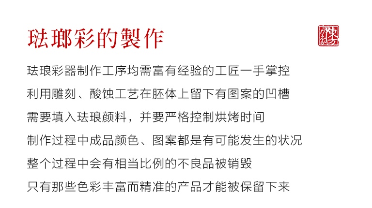 珐琅彩器制作过程相当细致,大部分工序均需富有经验的工匠一手掌控。利用雕刻、酸蚀工艺在胚体上留下有图案的凹槽,需要填入珐琅颜料,并要严格控制烘烤时间。但颜色是否会混色,或烧成后图案的轮廓边缘是否模糊,都是有可能发生的状况,整个过程中会有相当比例的不良品被销毁。经过层层挑选,只有那些色彩丰富而精准的产品才能被保留下来。