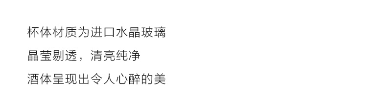 杯体材质为进口水晶玻璃,晶莹剔透,清亮纯净,酒体呈现出令人心醉的美。