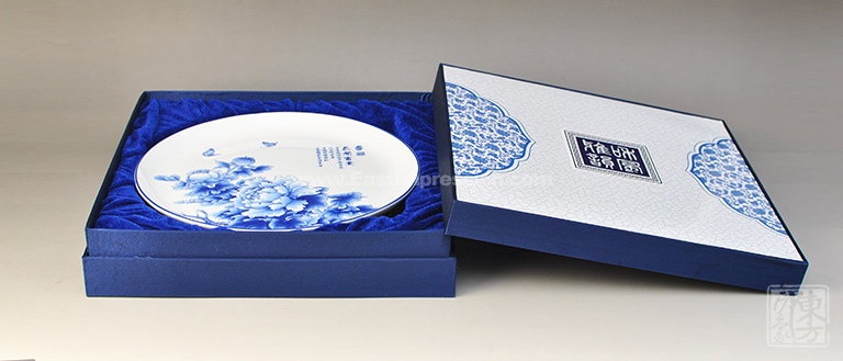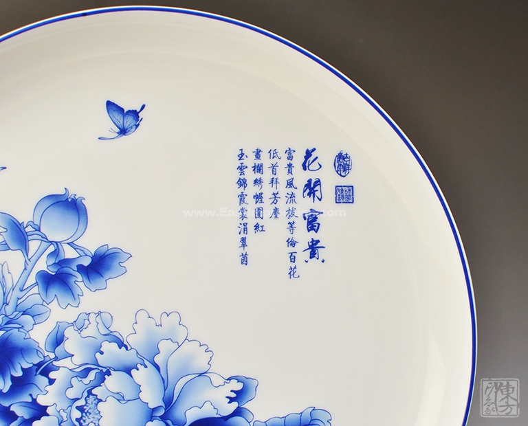 赏盘以国际公认的高档瓷种——骨瓷为瓷体,瓷质细腻白净,釉色晶莹亮丽,花面“青花牡丹图”采用釉上彩的装饰技艺精制而成。牡丹为“百花之王”,同时以咏牡丹的名诗题款,置于案头可装点生活,可不时欣赏这宁静含蓄的东方之美。