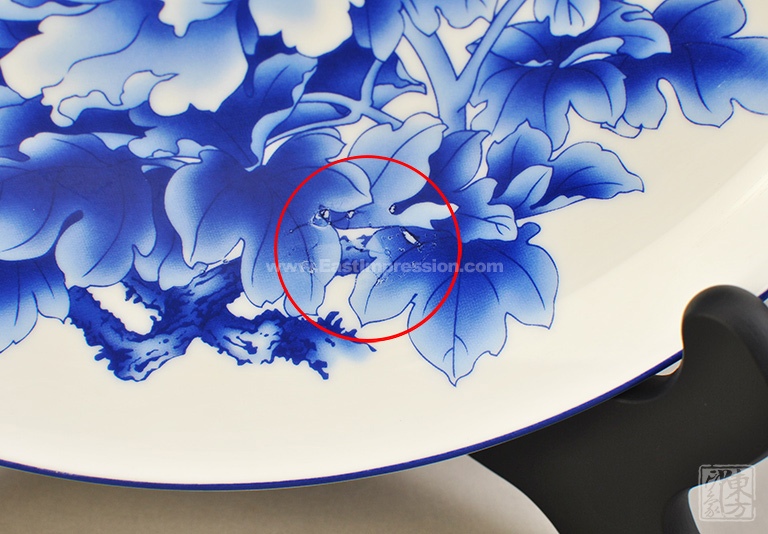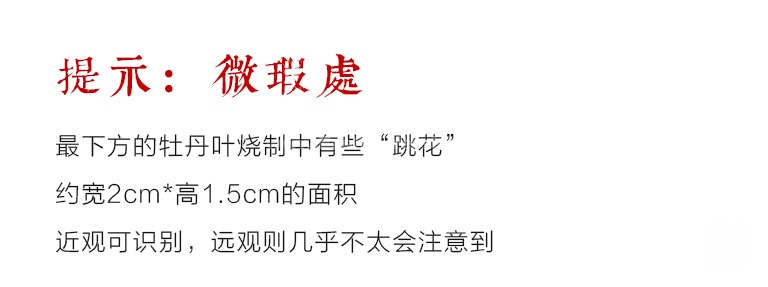 最下方的牡丹叶烧制中有些“跳花”,约宽2cm*高1.5cm的面积。近观可识别,远观则几乎不太会注意到。