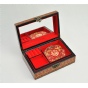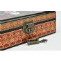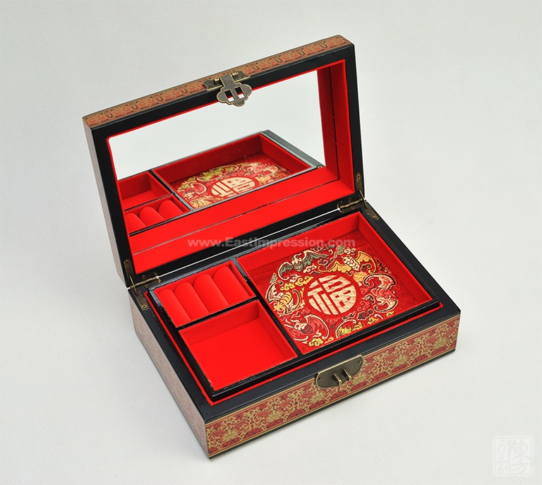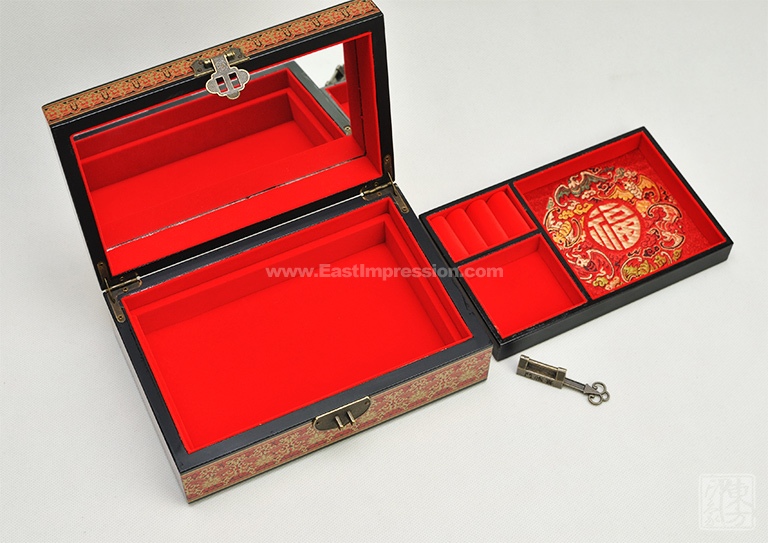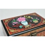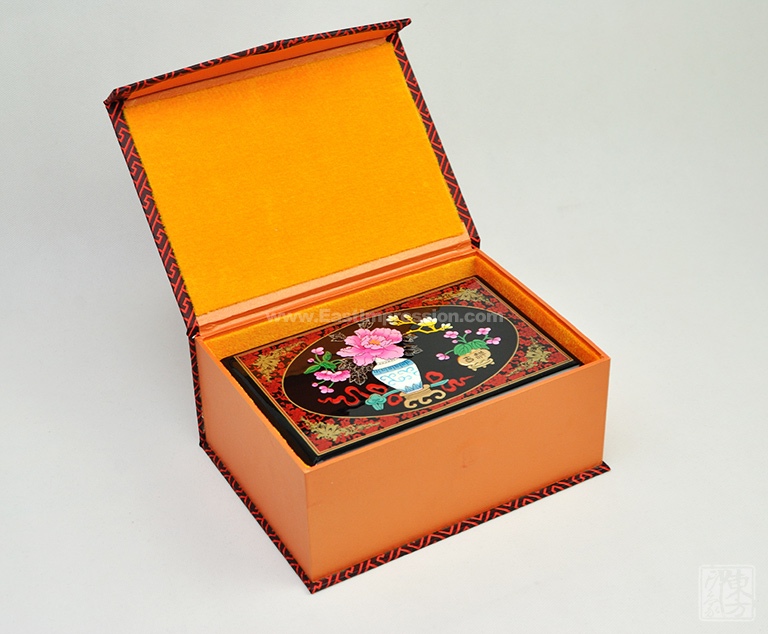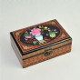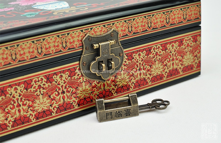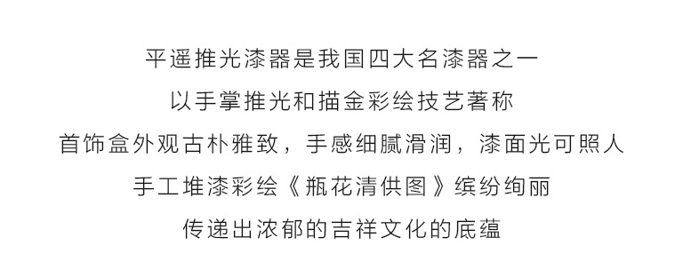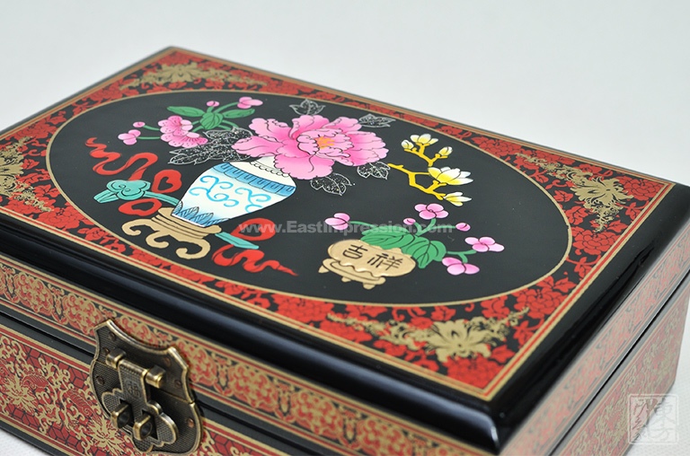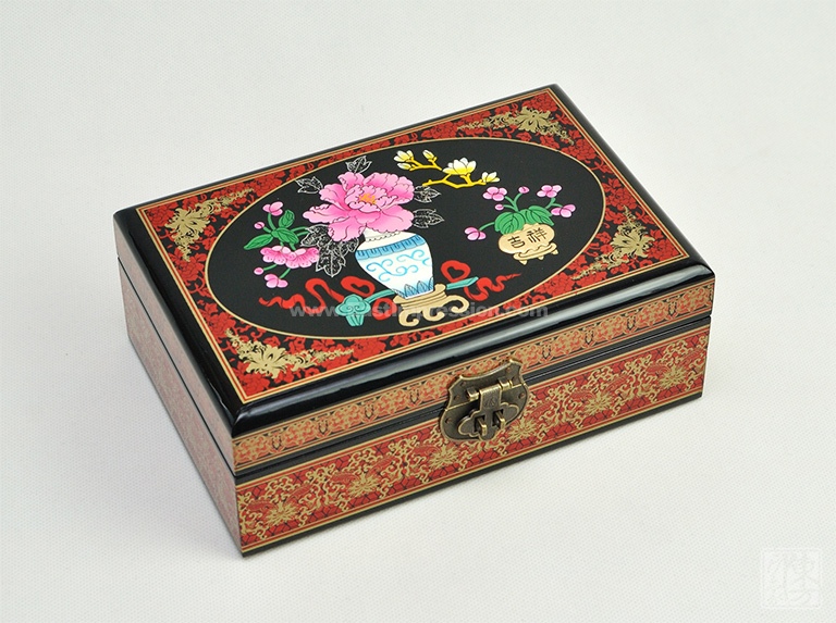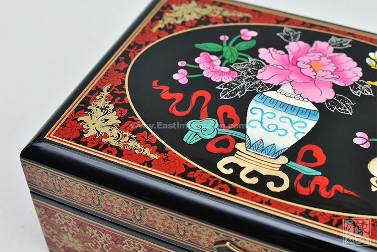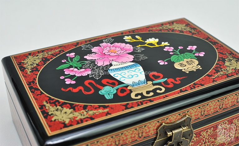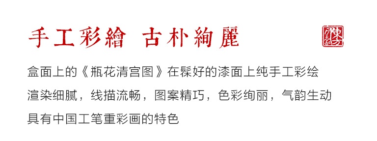 首饰盒面上的《瓶花清宫图》在髹好的漆面上纯手工彩绘,用笔渲染细腻,线描流畅,图案精巧,色彩绚丽,气韵生动,具有中国工笔重彩画的特色。