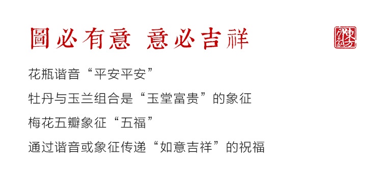 花瓶谐音“平安平安”,牡丹与玉兰组合是“玉堂富贵”的象征,梅花五瓣象征“五福”,通过谐音或象征传递“如意吉祥”的祝福。