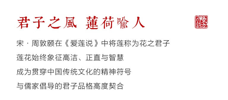 宋·周敦颐在《爱莲说》中将莲称为花之君子。莲花始终象征高洁、正直与智慧,成为贯穿中国传统文化的精神符号,与儒家倡导的君子品格高度契合。