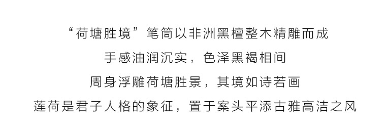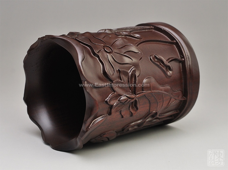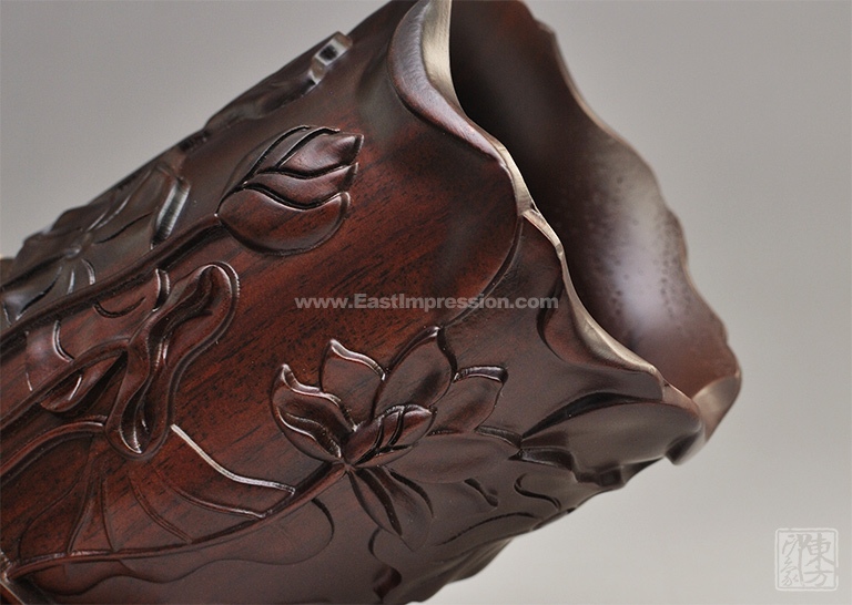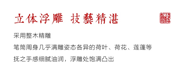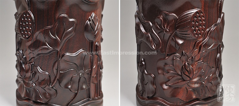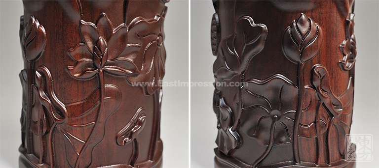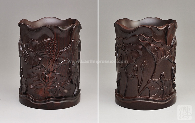 采用整木精雕,笔筒周身几乎满雕姿态各异的荷叶、荷花、莲蓬等,抚之手感细腻油润,浮雕处饱满凸出。