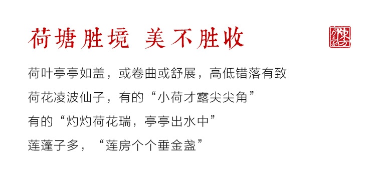 荷叶亭亭如盖,或卷曲或舒展,高低错落有致;荷花凌波仙子,有的“小荷才露尖尖角”,有的“灼灼荷花瑞,亭亭出水中”;莲蓬子多,“莲房个个垂金盏”。