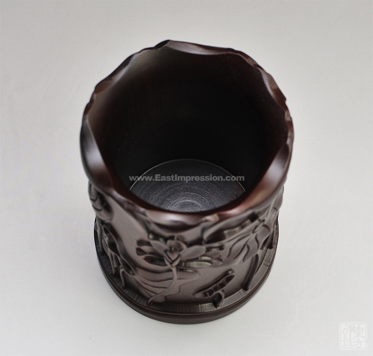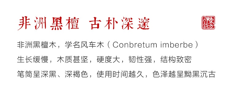 非洲黑檀木,学名风车木(Conbretum imberbe),生长缓慢,木质甚坚,硬度大,韧性强,结构致密。笔筒呈深黑、深褐色,使用时间越久,色泽越呈黝黑沉古。