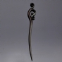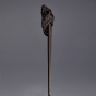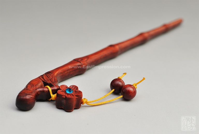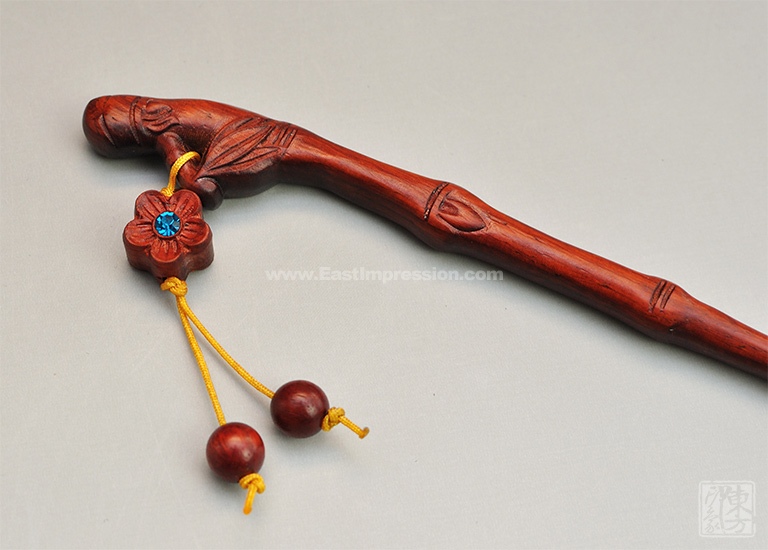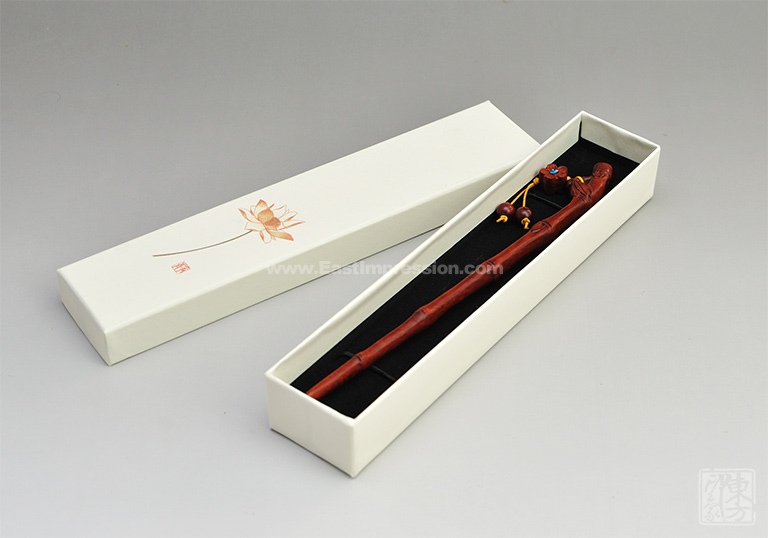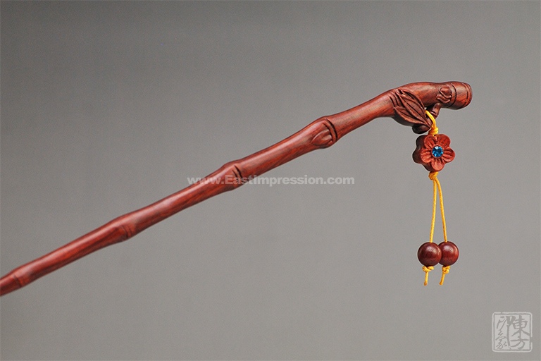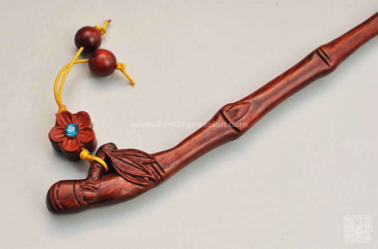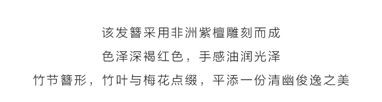 该发簪采用非洲紫檀雕刻而成,色泽深褐红色,手感油润光泽,竹节簪形,竹叶与梅花点缀,平添一份清幽俊逸之美。