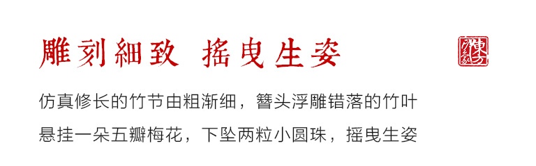 仿真修长的竹节由粗渐细,簪头浮雕错落的竹叶,悬挂一朵五瓣梅花,下坠两粒小圆珠,佩戴时随步伐晃动,摇曳生姿。