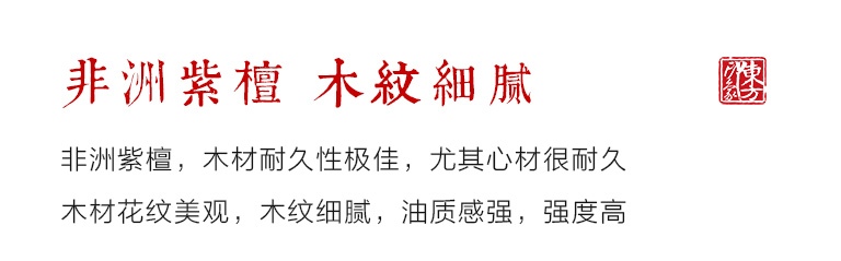 非洲紫檀,产地热带西非、非洲东部,木材耐久性极佳,尤其心材很耐久,木材花纹美观,木纹细腻,油质感强,强度高。