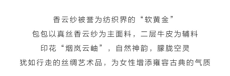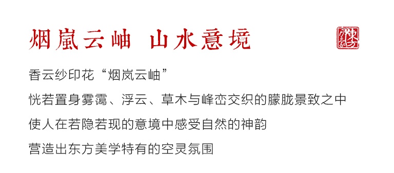香云纱印花图案,恍若置身雾霭、浮云、草木与峰峦交织的朦胧景致之中。“烟岚云岫”是中国传统绘画对气韵生动的美学追求,使人在若隐若现的意境中感受自然的神韵,营造出东方美学特有的空灵氛围。