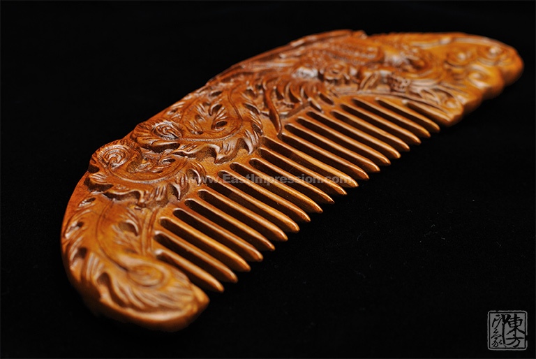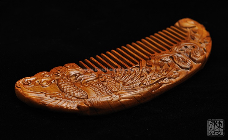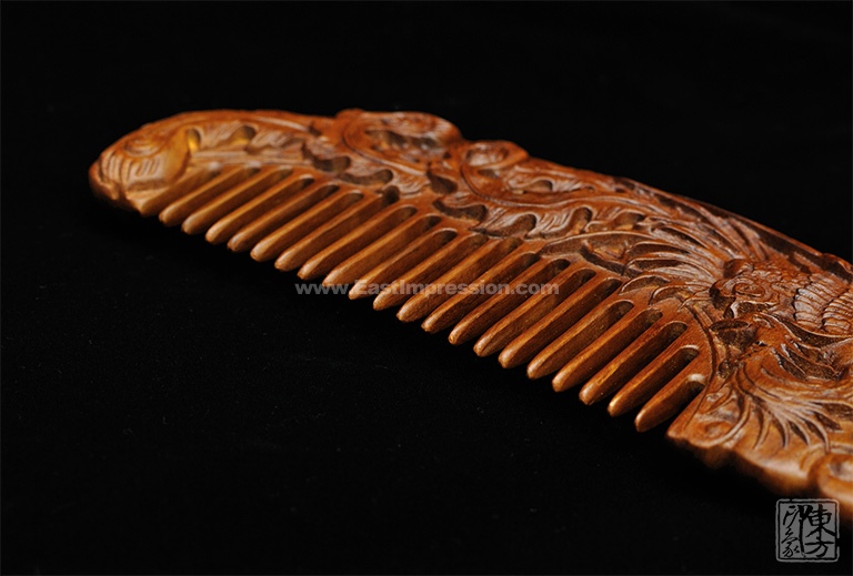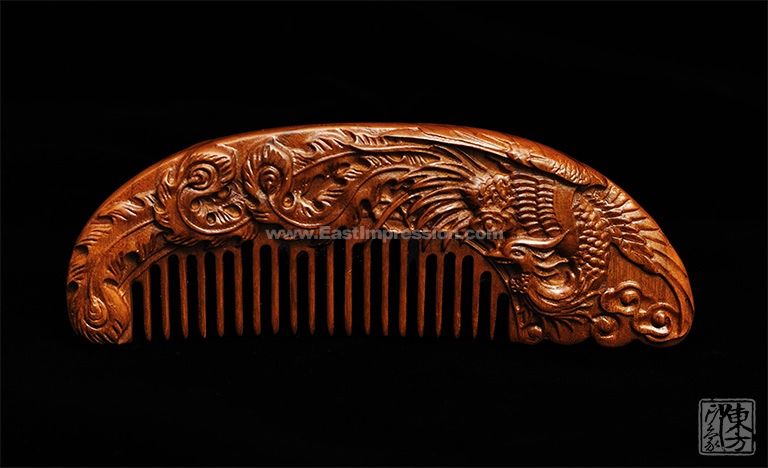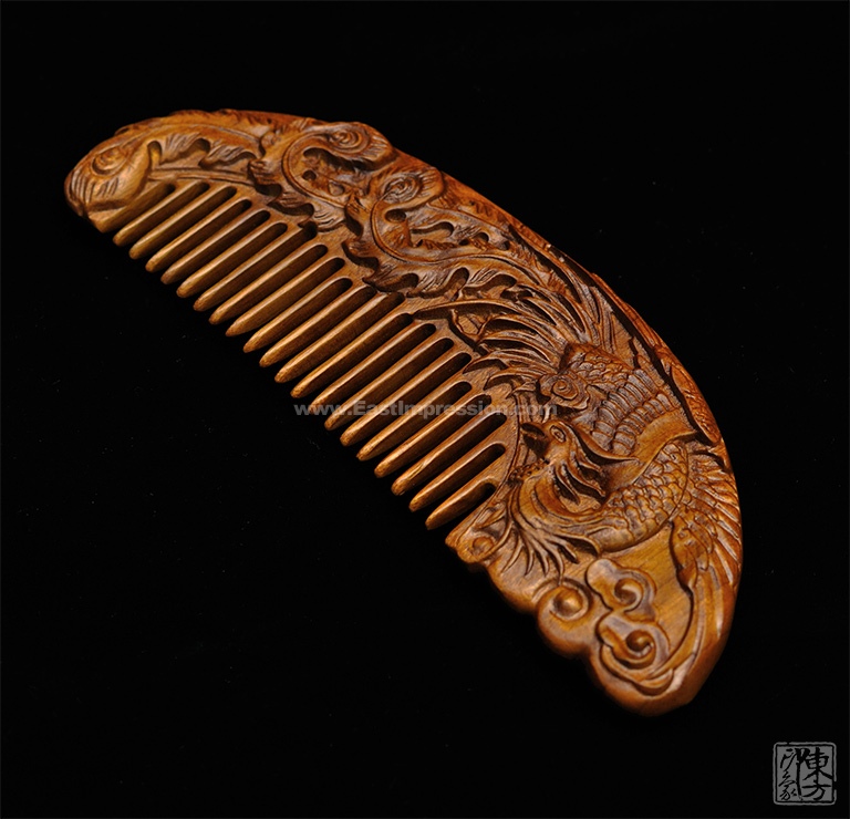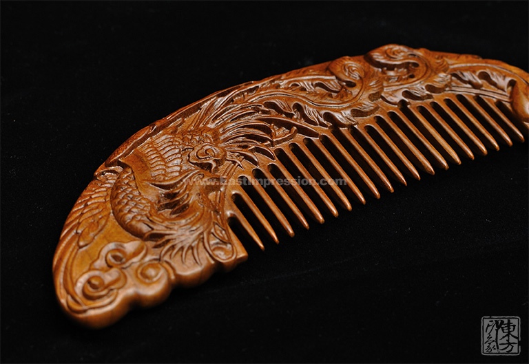 在古代神话传说中,凤凰是一种象征吉祥、和谐与尊贵的神鸟。凤凰于飞,祥云朵朵,将其图案双面精雕细琢于梳背之上,纹饰细腻精致、繁复优美。