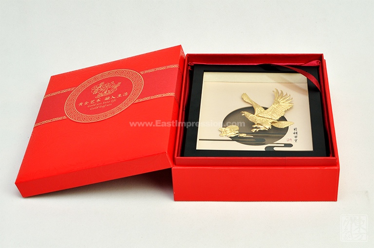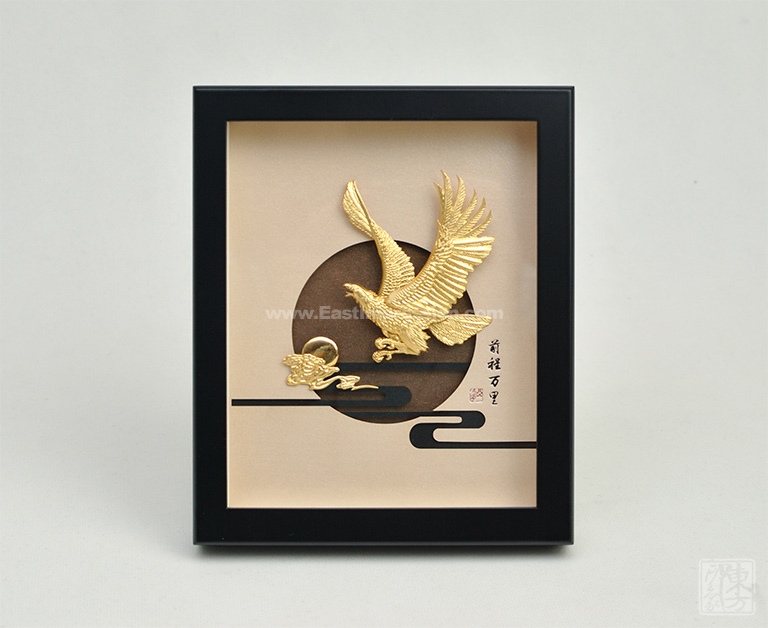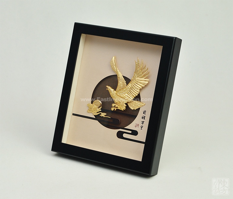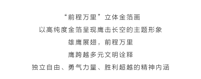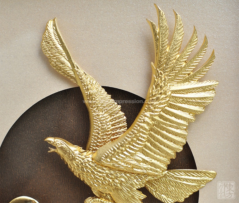 “鹰击长空”立体金箔材料由台湾进口,金箔采用高纯度金箔制作,表面金属含金量Au999‰。由于黄金的稀有和珍贵,金箔装饰也成了尊贵奢华的象征,具有色泽光亮、厚度均匀、经久不变色的特点。