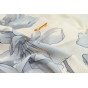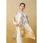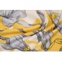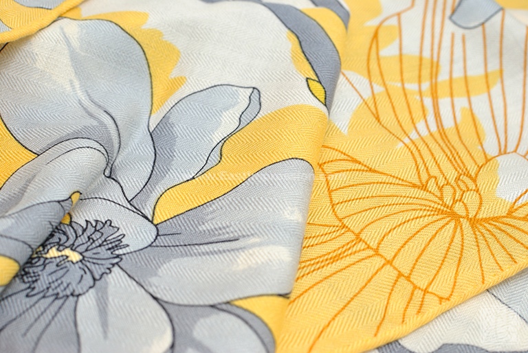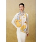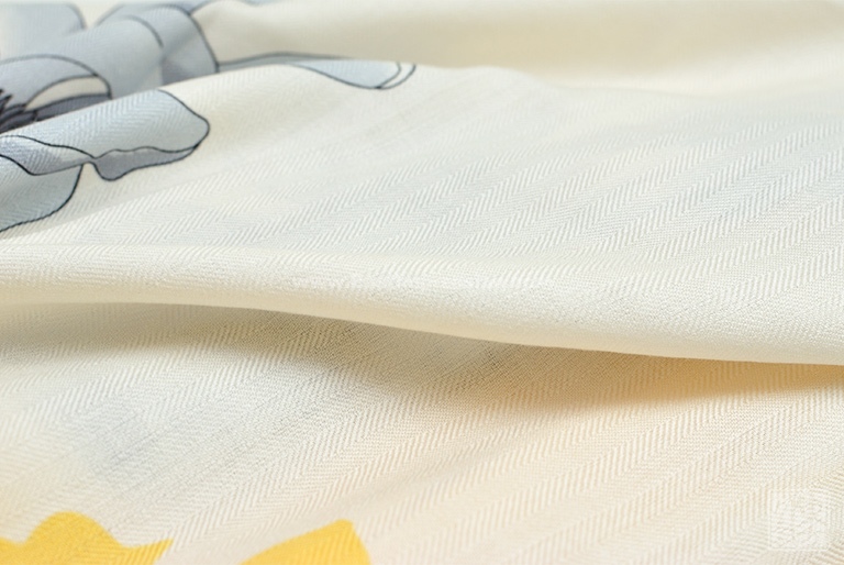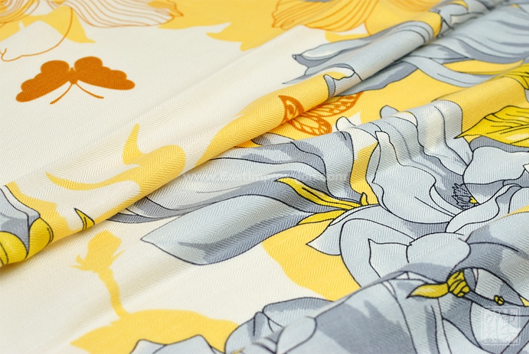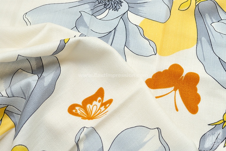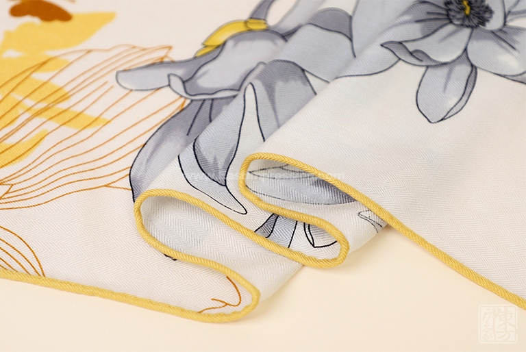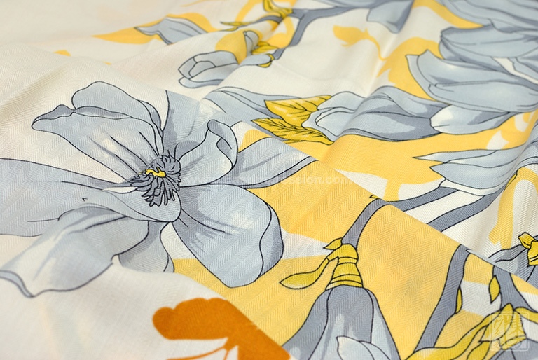米白的底色上,明亮的鹅黄引人注目却并不张扬。玉兰花枝干与花朵以灰色调呈现既平衡了鹅黄的亮丽,又契合玉兰花玉骨冰姿的孤傲。几只蝴蝶蹁跹花间,棕色调用以点缀。图案及色彩的搭配冷暖相宜,颇具清新文艺范。